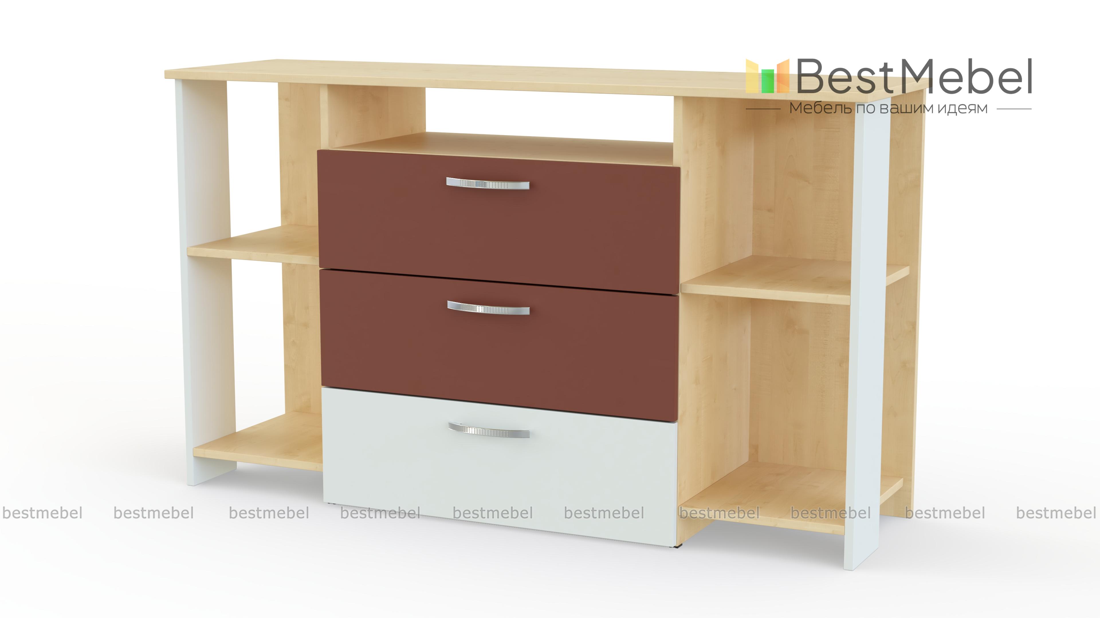 Комод Дабл 3 BMS дополнит интерьер современной спальни или гостиной и поможет разместить большое количество вещей, а также оформить зону ТВ. Комбинированная модель оборудована широкой столешницей, тремя выдвижными ящиками, нишей под аппаратуру и открытыми боковыми секциями для книг или декоративных мелочей. Корпус светлого древесного оттенка дополняет фасад в белом и графитовом цвете. Купить комод Дабл 3 BMS по доступной цене вы сможете в нашем интернет-магазине.