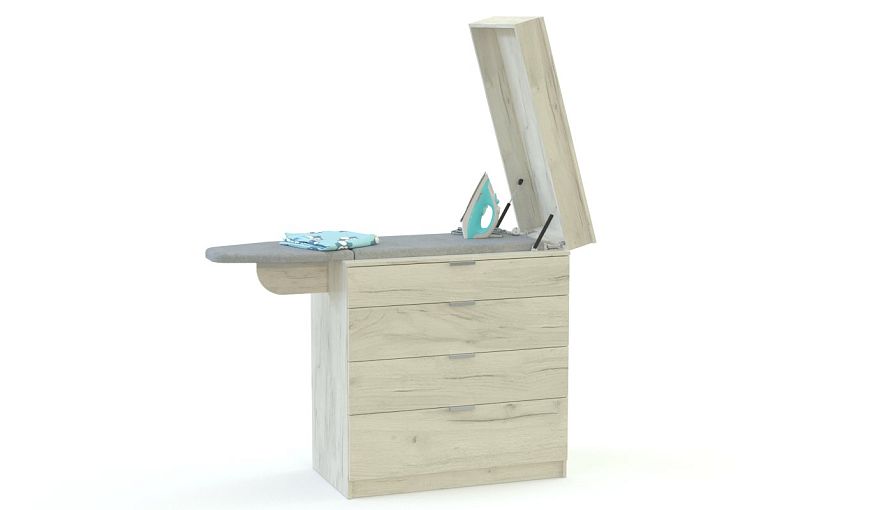 Комод Шафран-6 BMS поможет вам эффективно использовать доступное пространство. Трендовая модель с имитацией древесной текстуры и стильными торцевыми ручками гармонично впишется в интерьер любого из помещений дома. Комод оборудован четырьмя выдвижными ящиками разных размеров для удобного хранения вещей, а также складной боковой секцией и скрытой под откидной столешницей гладильной доской. Купить комод Шафран-6 BMS и сделать интерьер комфортным вам поможет наш интернет-магазин.