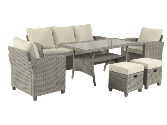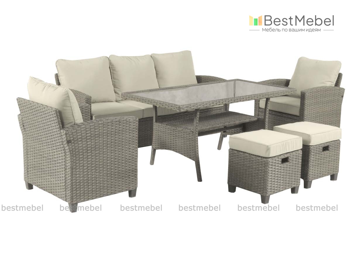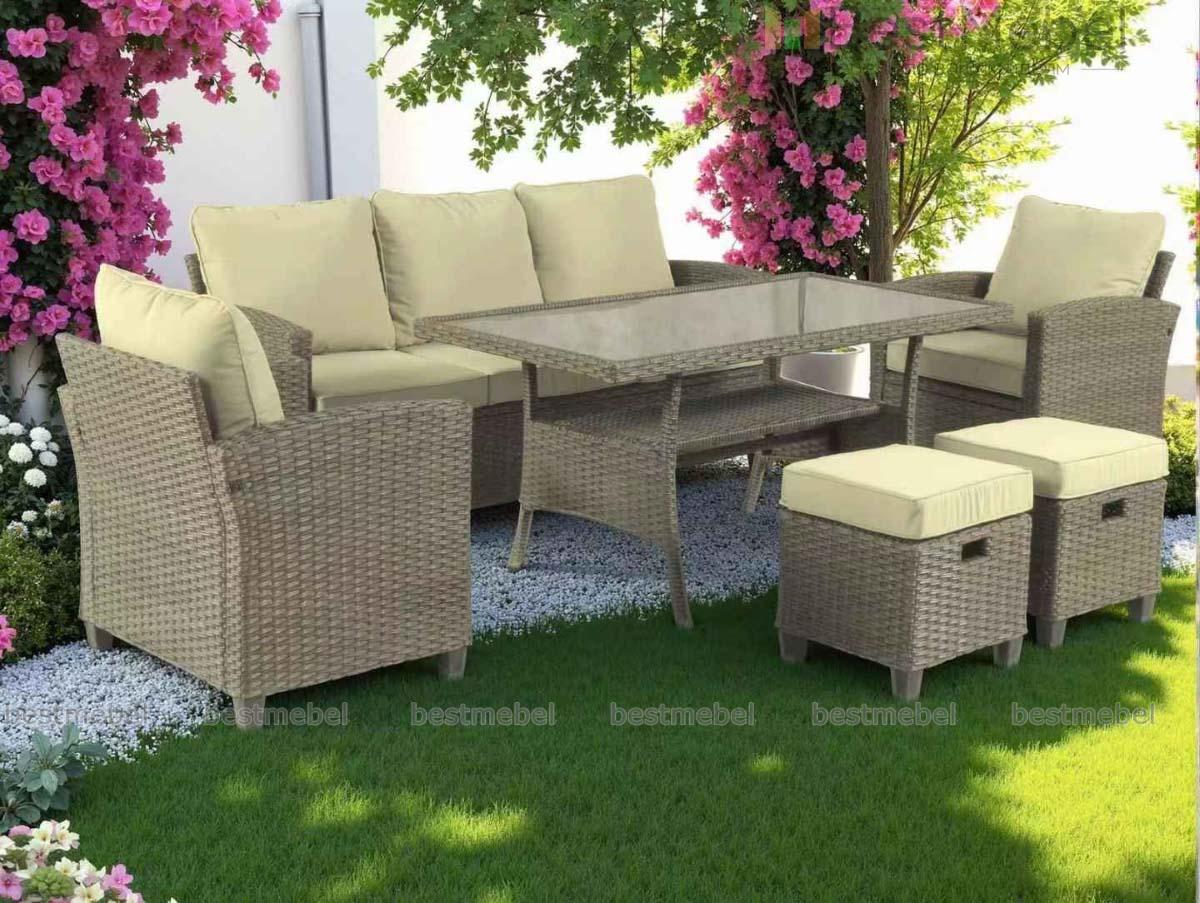 Комплект Джуми включает в себя все необходимое для комфортного отдыха на открытом воздухе: просторный диван, широкий обеденный стол со столешницей из прочного закаленного стекла толщиной 5 мм, два кресла и два пуфика. Предметы отличаются эргономичной формой и выполнены в трендовом оттенке из высококачественного материала с имитацией ротангового плетения. Сиденья дополнены мягкими подушками толщиной 8 см. Купить комплект Джуми приглашаем в наш интернет-магазин.