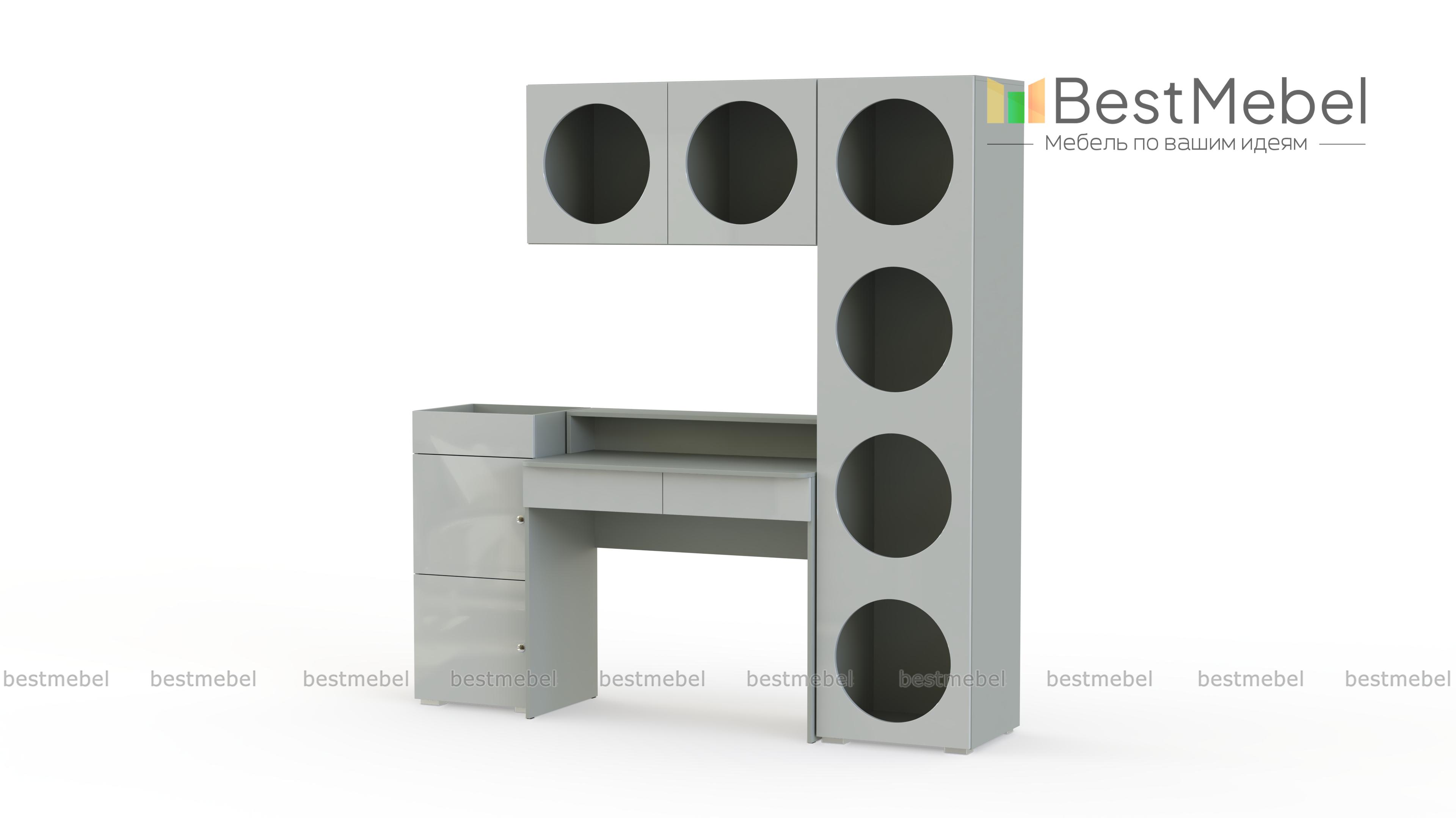 Детская стенка Авелин 5 BMS поможет создать эстетичную рабочую зону. Гладкие светлые фасады компьютерного стола и тумбы скомбинированы с круглыми вырезами стеллажа и навесной полки. Помимо стильного оформления, эта комплектация отличается большим количеством открытых мест для хранения, позволяя разместить на виду все необходимые материалы. Купить детскую стенку Авелин 5 BMS с индивидуальным подбором цвета и размеров приглашаем в наш интернет-магазин.