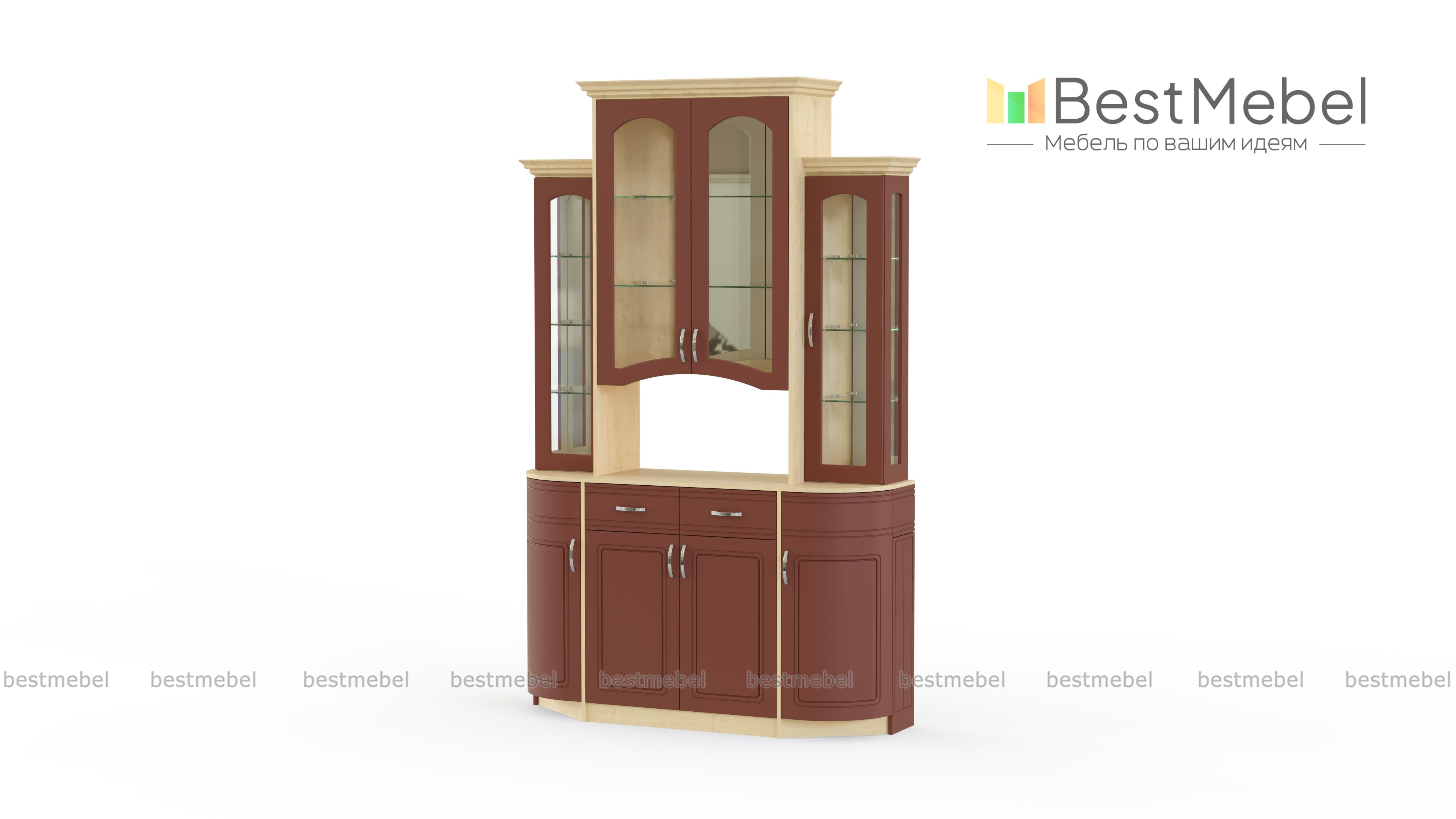 Шкаф под посуду Вероника 2 BMS станет оригинальным и практичным дополнением интерьера столовой или гостиной. Элегантная модель в классическом стиле позволит эффектно разместить посуду и предметы декора в застекленных шкафчиках-витринах. Нижняя часть шкафа – комбинация вместительных распашных отделений и выдвижных ящиков. Гнутые фасады декорированы неброской фрезеровкой и изящными ручками. Купить шкаф под посуду Вероника 2 BMS, подобрав оптимальное цветовое решение, вы сможете в нашем интернет-магазине.