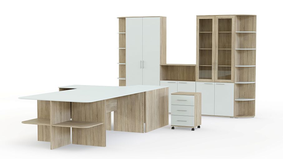 Вместительные тумбы и шкафы позволят компактно разместить папки, договора, книги и многое другое. Для вещей, которые должны быть на виду, предусмотрены угловые шкафы с полками. Здесь можно разместить дипломы, сертификаты, награды и в общем все, чем вы гордитесь в своей работе.