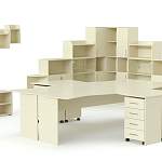 В комплект входит огромное количество стеллажей, полочек и шкафов. Они имеют оригинальный дизайн и напоминают детский конструктор. Отсутствие строгого офисного интерьера и разнообразие форм будет способствовать творческой атмосфере и хорошему настрою. При заказе мебели можно выбрать цвет оформления корпуса и фасада.