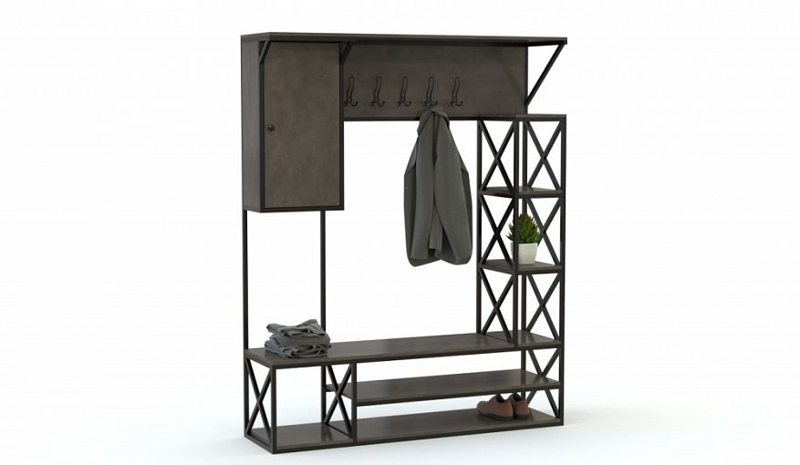 Прихожая Фанни 14 BMS, выполненная в тёмных бетонных тонах, предназначена для помещений, располагающих большой площадью. Модель удачно компонирует с элементами стилей лофт или хай-тек благодаря лаконичному металлическому каркасу. Прихожая включает в себя всё самое необходимое – распашной шкаф для хранения мелких бытовых вещей или головных уборов, компактно расположенные крючки для верхней одежды, открытые полки, сиденье, на котором также можно разместить сумки, и полки для хранения повседневной обуви. Купить прихожую Фанни 14 BMS по выгодной стоимости вы можете в нашем фирменном интернет-магазине.