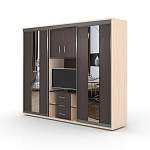 Шкаф-купе Гостинка BMS - практичное решение для организации пространства как в просторных, так и в малогабаритных помещениях. Шкаф комбинированной конструкции включает в себя отделения с раздвижными дверцами, дополненные центральной открытой секцией с тумбой, нишей под ТВ и распашной антресолью. Вы сможете не только разместить гардероб и постельное белье, но и оригинально оформить зону отдыха, сэкономив полезную площадь. Фасады древесных тонов декорированы зеркальными вставками. Купить шкаф-купе Гостинка BMS, подобрав нужные параметры, приглашаем в наш интернет-магазин.