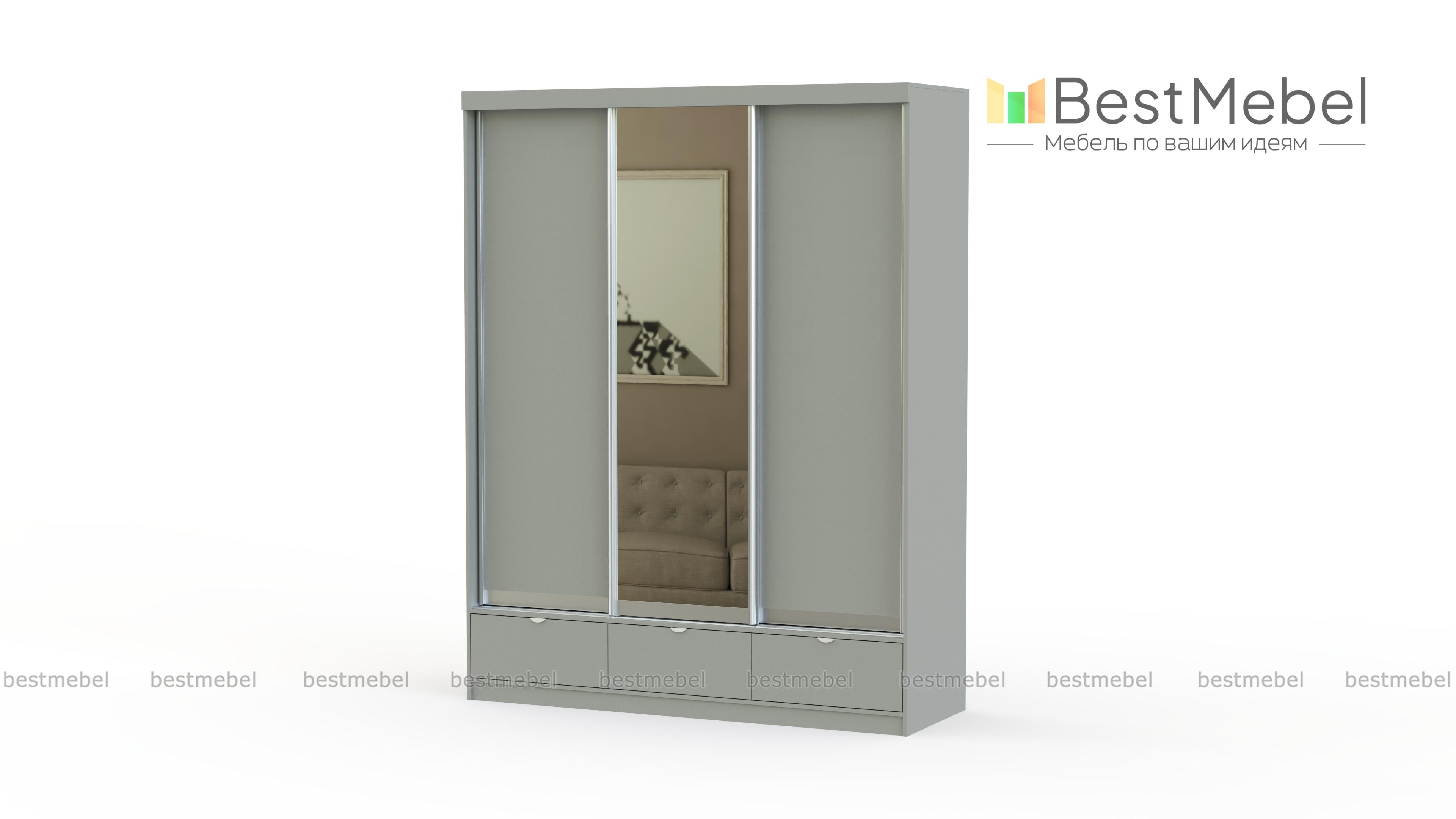 Вместительный трехдверный шкаф с выдвижными ящиками. В центре фасада расположено зеркало, благодаря которому изделие не сморится громоздким и габаритным. Шкаф-купе Мадрид можно поставить около стены в просторном доме, или разделить им помещение на зоны в однокомнатной квартире. Конструкция шкафа предусматривает наличие 6 просторных ниш, 2 отделений со штангами для вешалок и 3 выдвижных ящиков. Изделие изготовлено из ламинированного ДСП, стойкого к механическим повреждениям. Этот материал прост в уходе и имеет сохраняет привлекательный внешний вид.