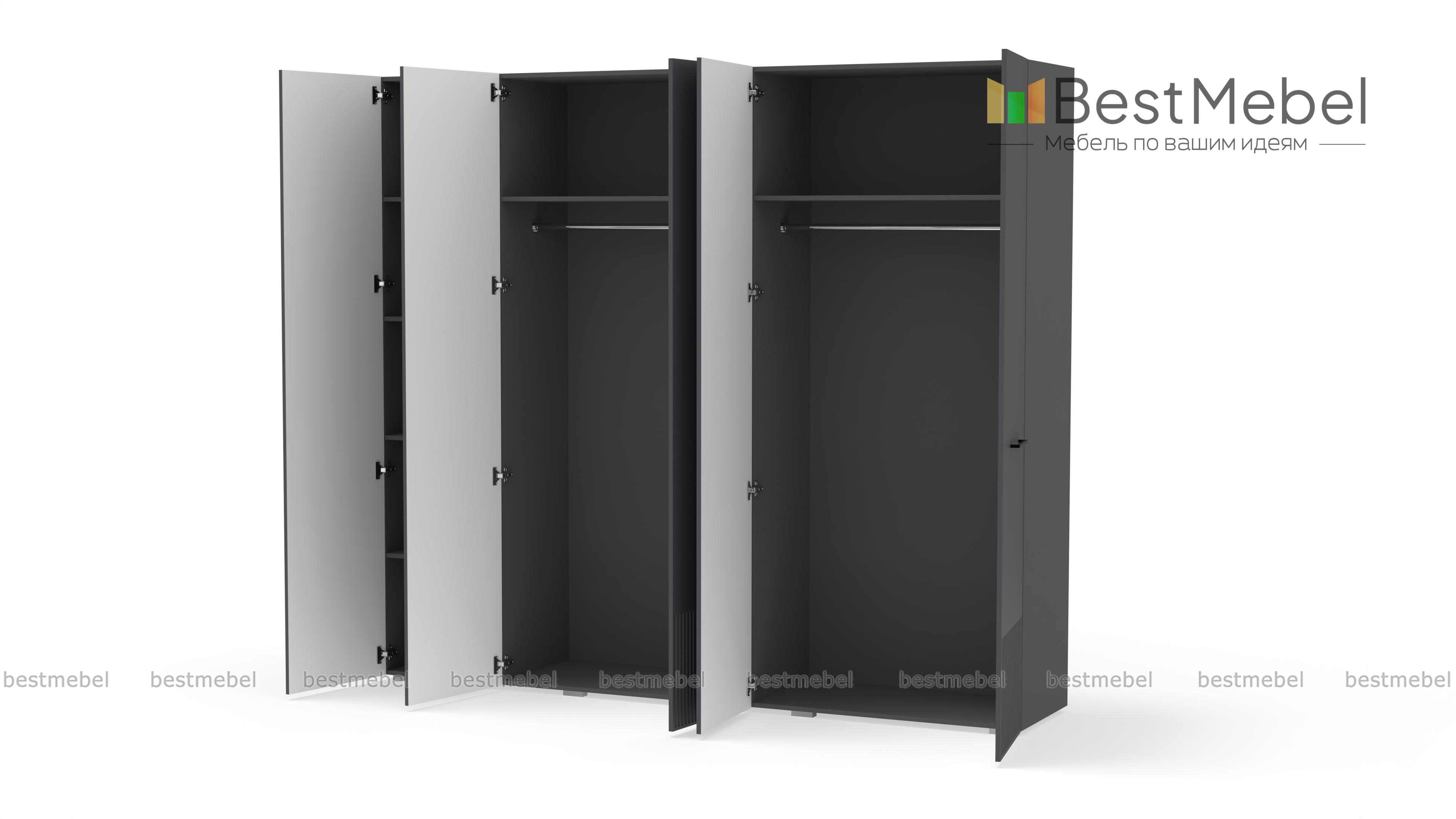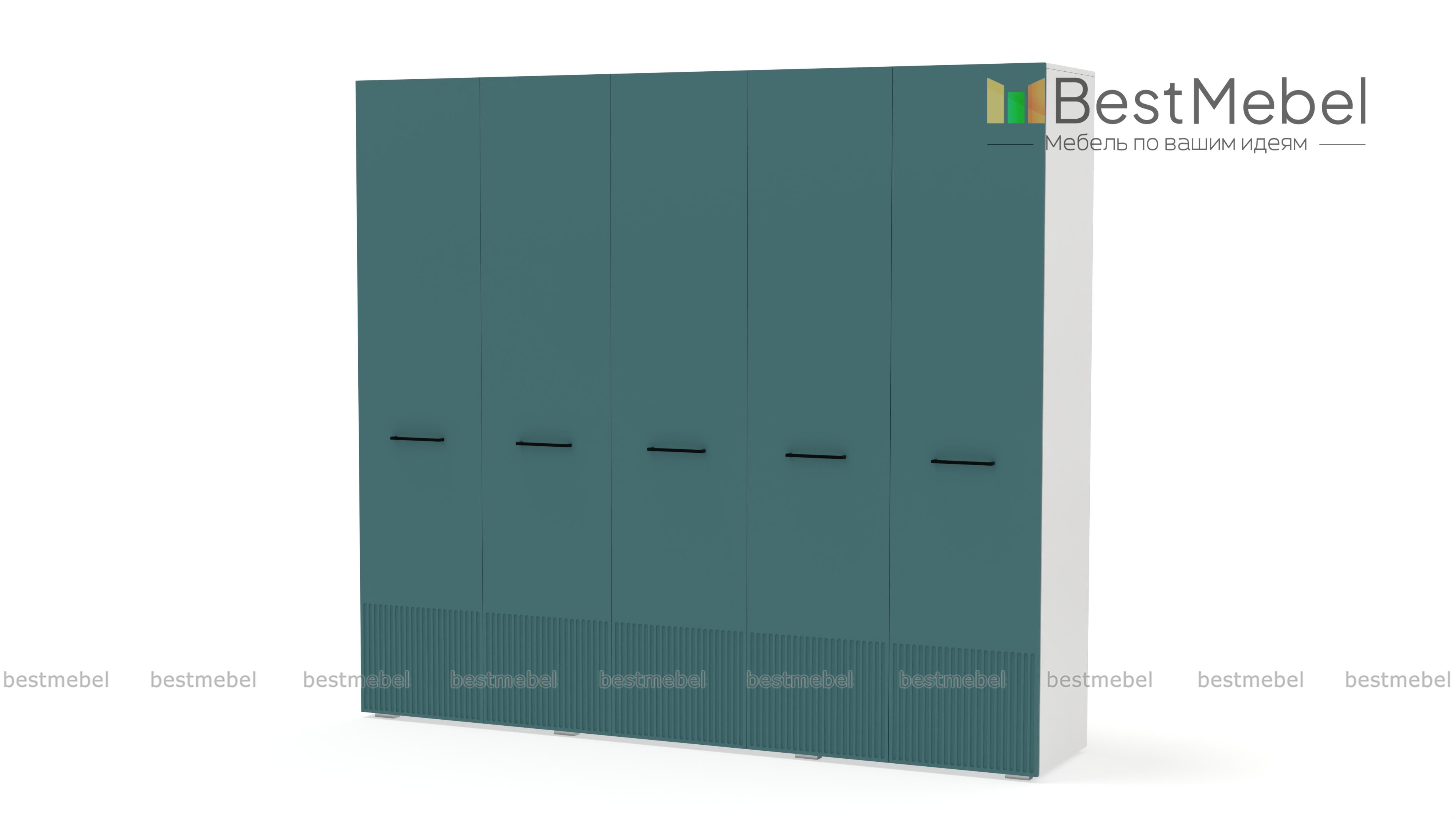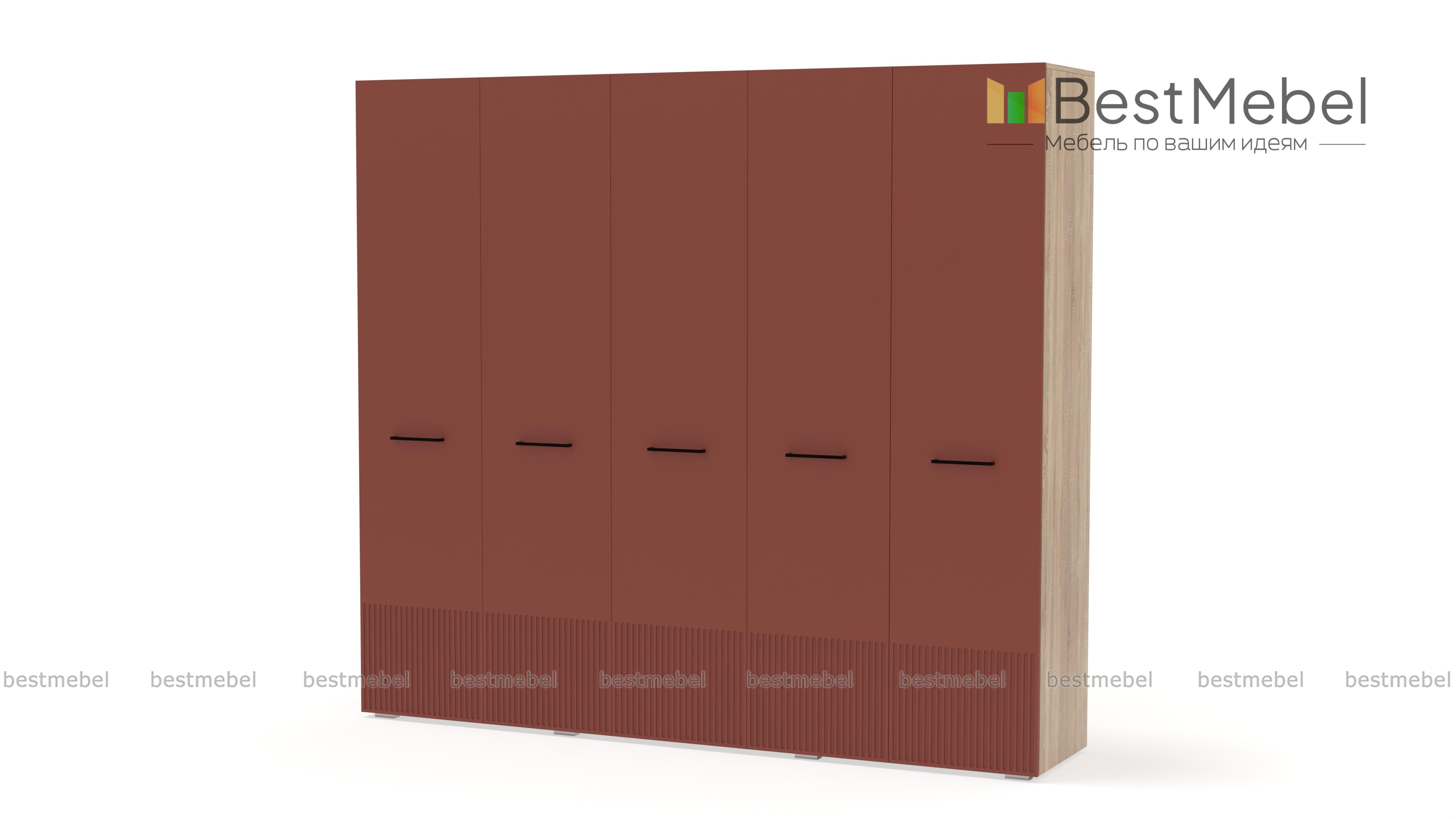 Шкаф распашной Декарт 5 BMS сочетает простую традиционную форму и актуальный дизайн. На сплошном светлом фасаде из МДФ выделяются поперечные ручки-скобы и фрезерованный рельеф, создавая визуально легкую конструкцию. Пятидверный гардероб позволяет организовать хранение с помощью пары штанг, вместительных верхних и бельевых полок. Купить шкаф распашной Декарт 5 BMS в удобном размере и любых оттенках из каталога вы сможете на сайте нашего интернет-магазина.