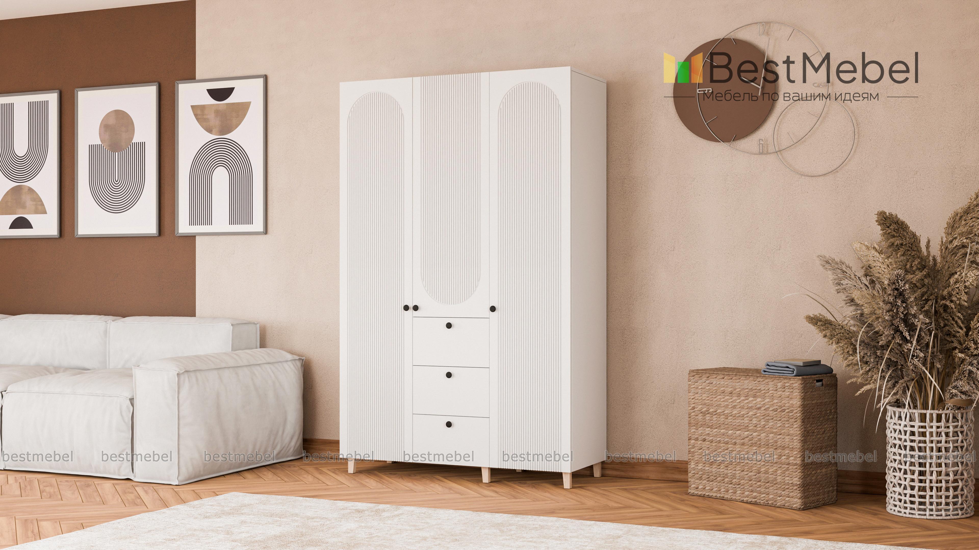 Шкаф распашной Рене 22 BMS с высокими ножками прекрасно подходит для меблировки спален, прихожих и гостиных. Помимо распашных отделений для белья и одежды трехдверный шкаф оборудован рядом из трех выдвижных ящиков, предназначенных для мелочей. На стильном темном фасаде из МДФ — оригинальный рельеф и миниатюрные круглые ручки. Купить шкаф распашной Рене 22 BMS в оттенках из нашего каталога и необходимом размере вы сможете недорого на сайте интернет-магазина.