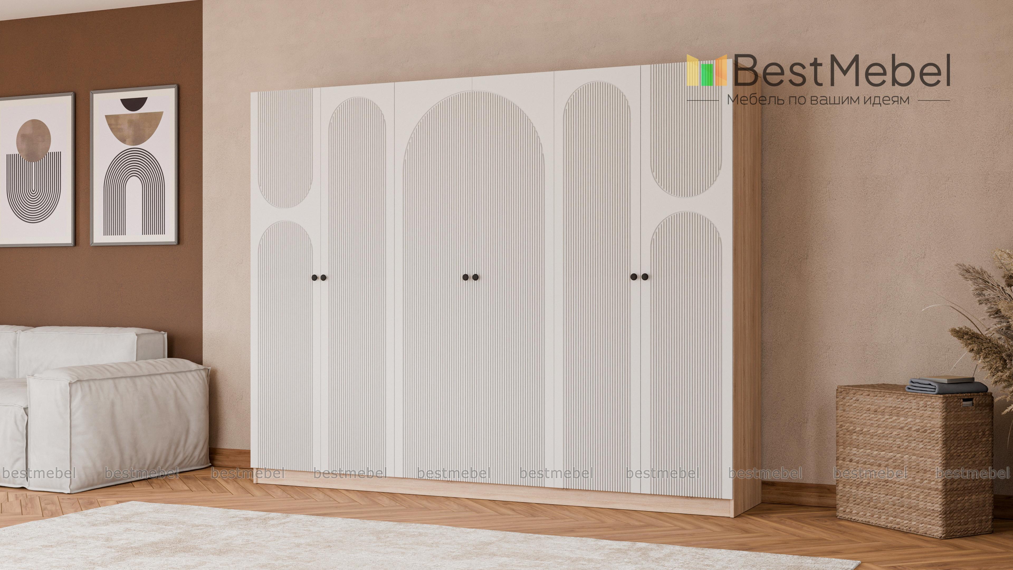 Шкаф распашной Рене 34 BMS отличается вместительностью и выразительным современным дизайном. На темном фасаде эффектно смотрится фрезеровка, корпус из ламинированной ДСП выполнен в древесных тонах. Шестидверная модель укомплектована необходимыми для хранения одежды на вешалках, трикотажа и постельных принадлежностей мебельными штангами и полками. Купить шкаф распашной Рене 34 BMS вы сможете на сайте нашего интернет-магазина в удобном размере и оттенке из каталога.
