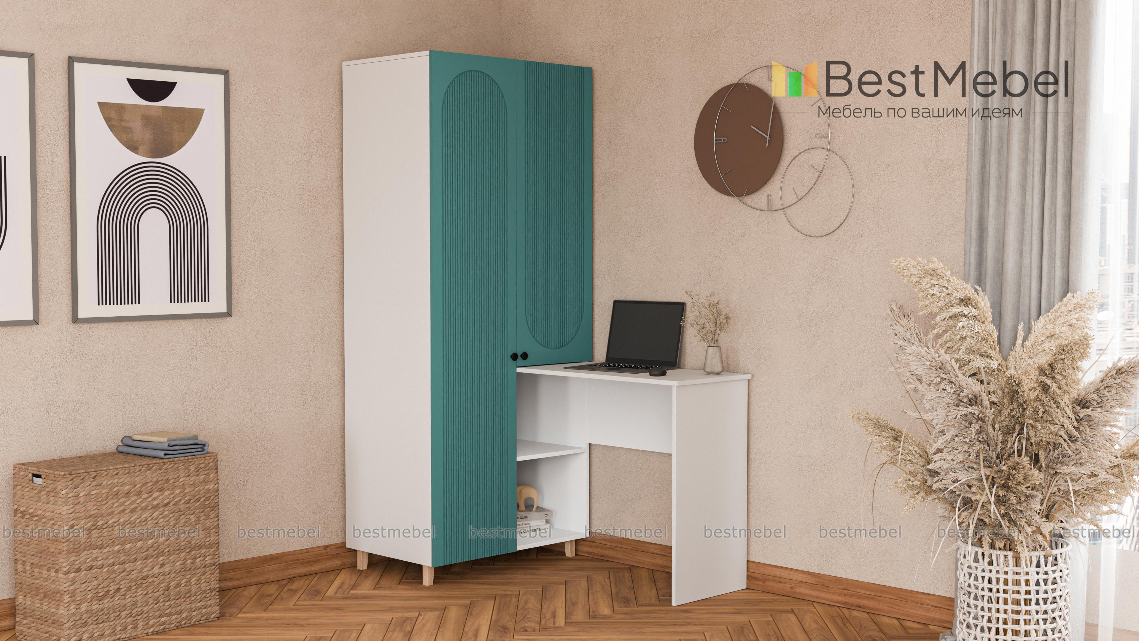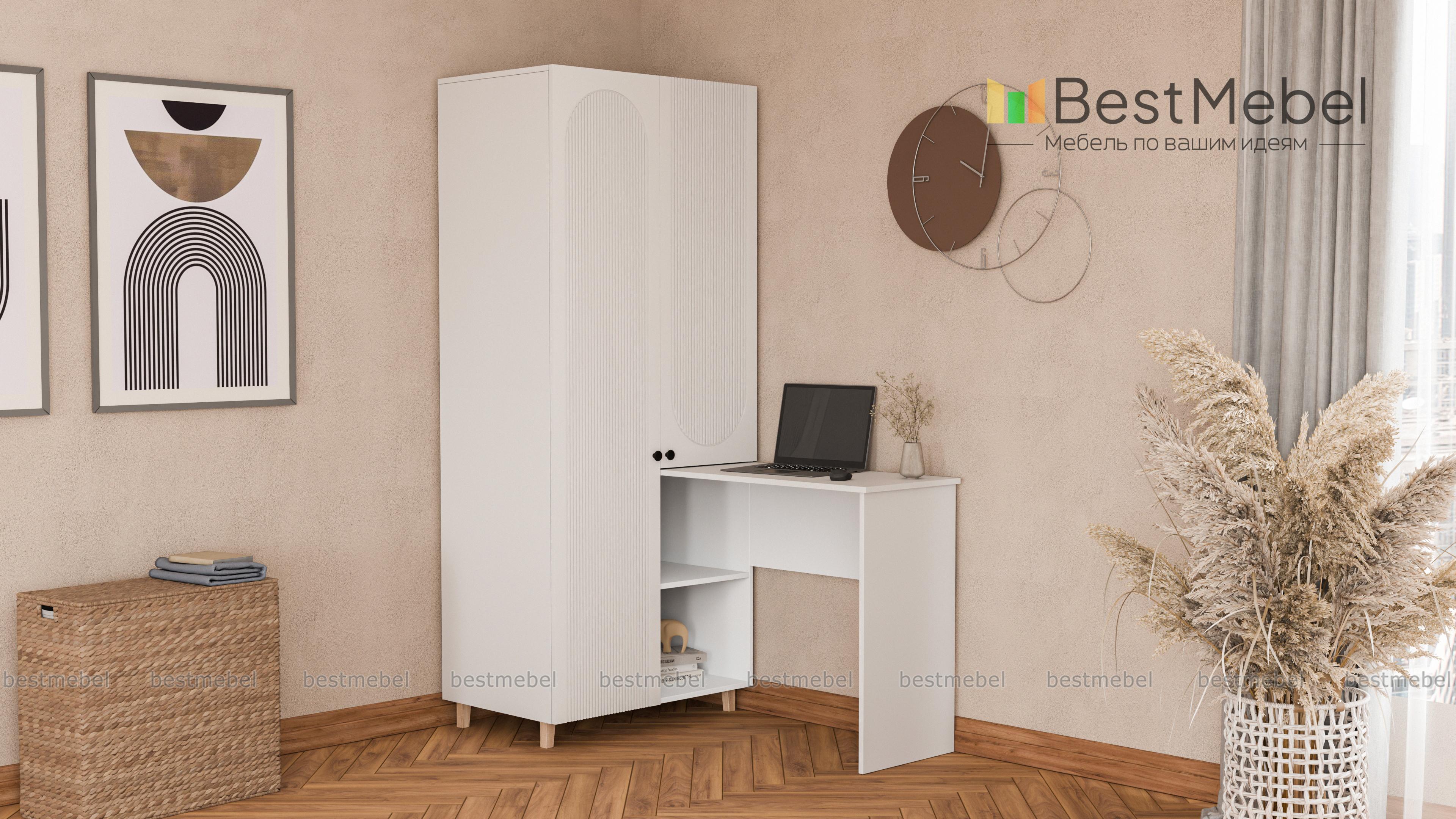 Шкаф со столом Рене 5 BMS обеспечит значительную экономию пространства в небольшой квартире или студии. Конструкция с распашными отделениями и открытыми полками позволяет разместить как одежду, так и материалы для работы или учебы. Письменный столик прямоугольной формы располагается под углом к стильному двухдверному шкафу с рельефным фасадом. Купить шкаф со столом Рене 5 BMS вы сможете на сайте нашего интернет-магазина с изготовлением по индивидуальным размерам.