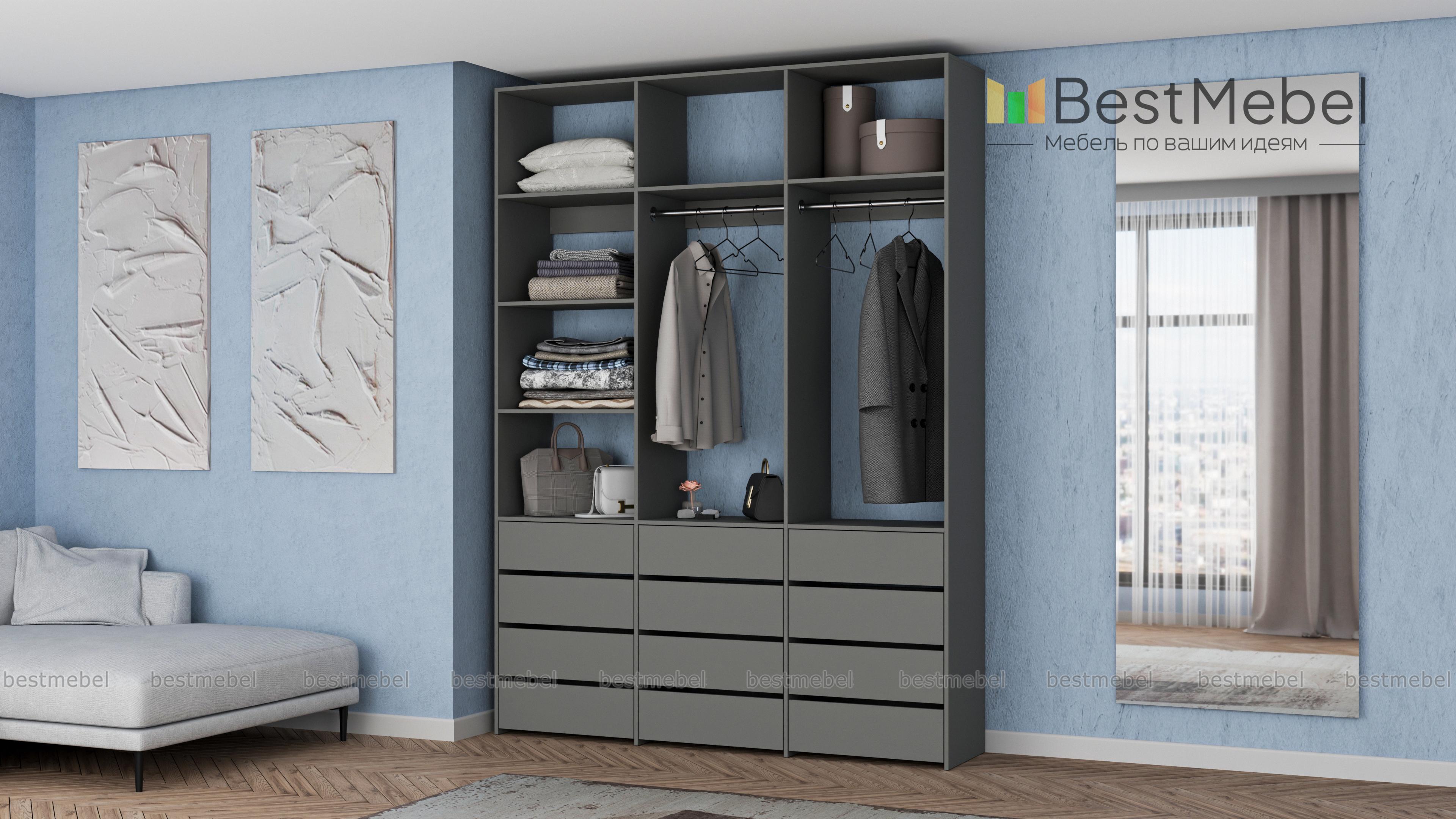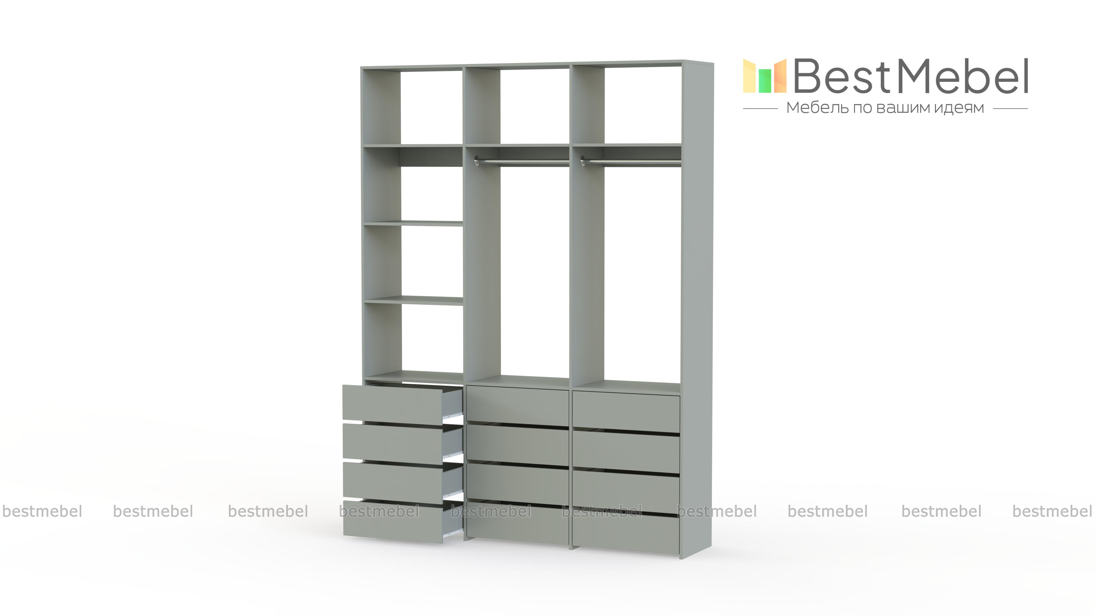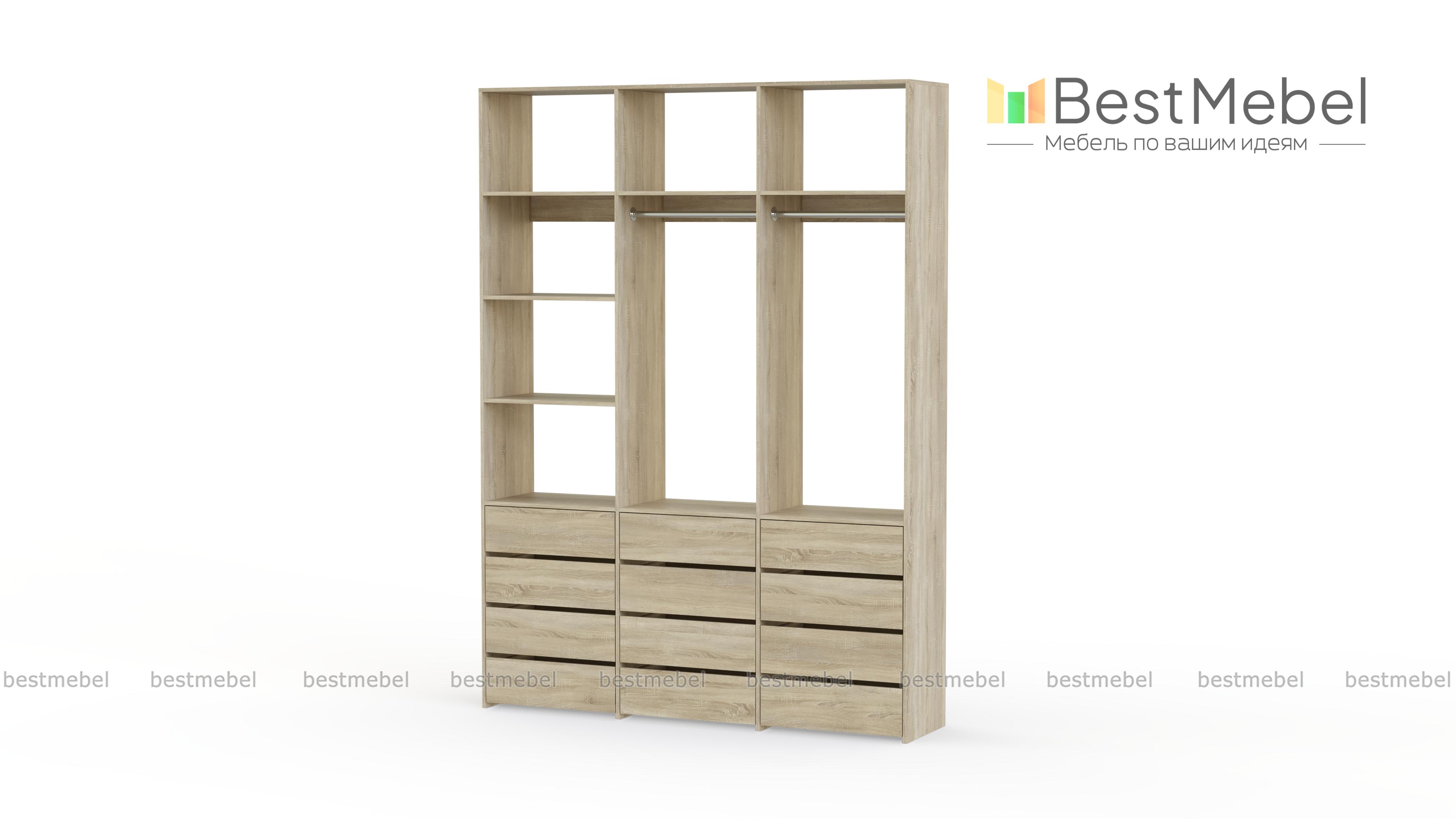 Стеллаж для одежды Мирта 48 BMS имеет минималистичный и функциональный дизайн. Трехсекционная конструкция включает в себя штанги для вешалок с одеждой, выдвижные ящики для белья и верхние полки, отделение слева для удобства также разделено двумя полками. Материал изготовления — прочная и долговечная ламинированная плита. Купить стеллаж для одежды Мирта 48 BMS, выполненный по индивидуальным размерам, вы сможете недорого на сайте нашего интернет-магазина.