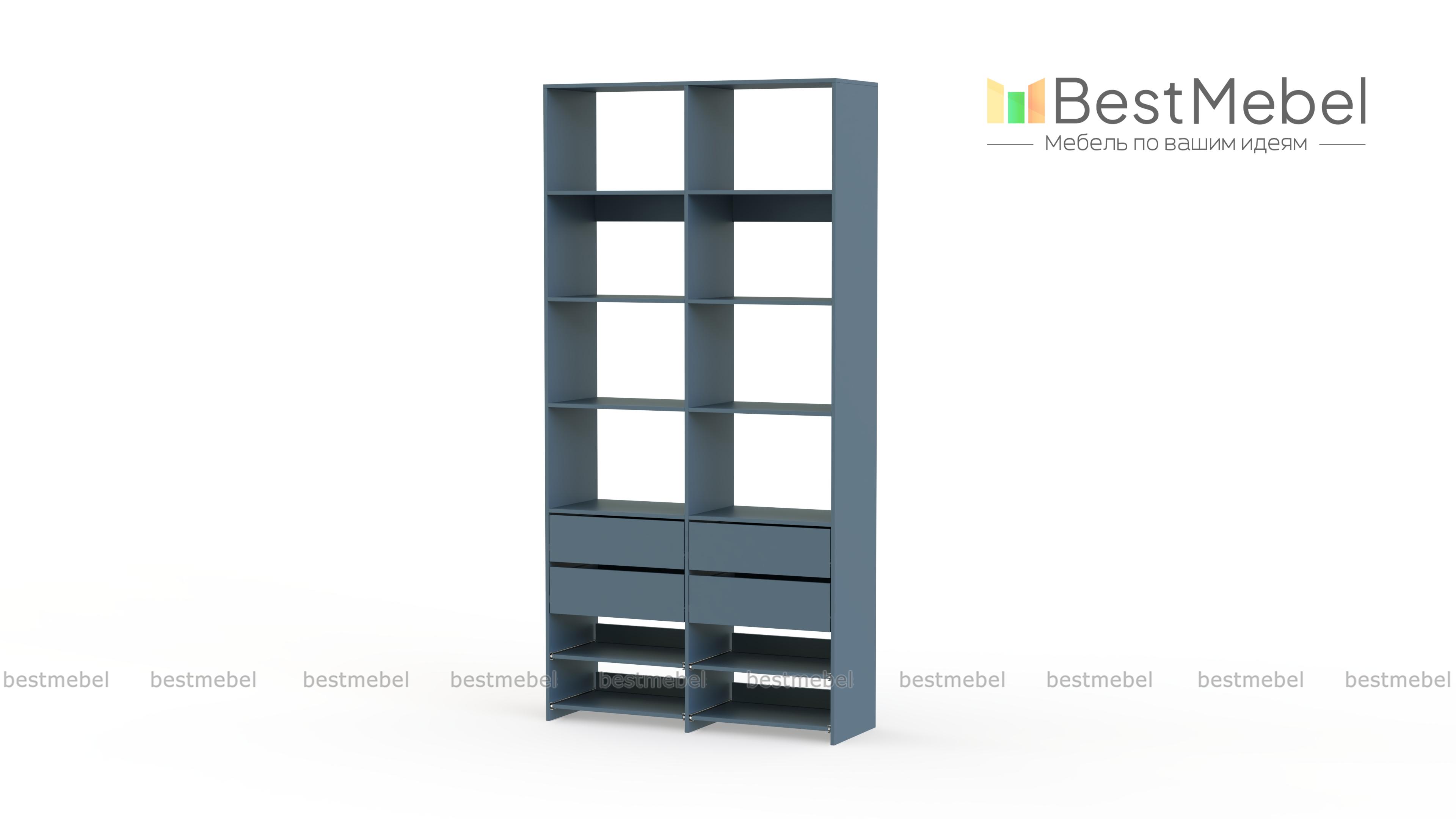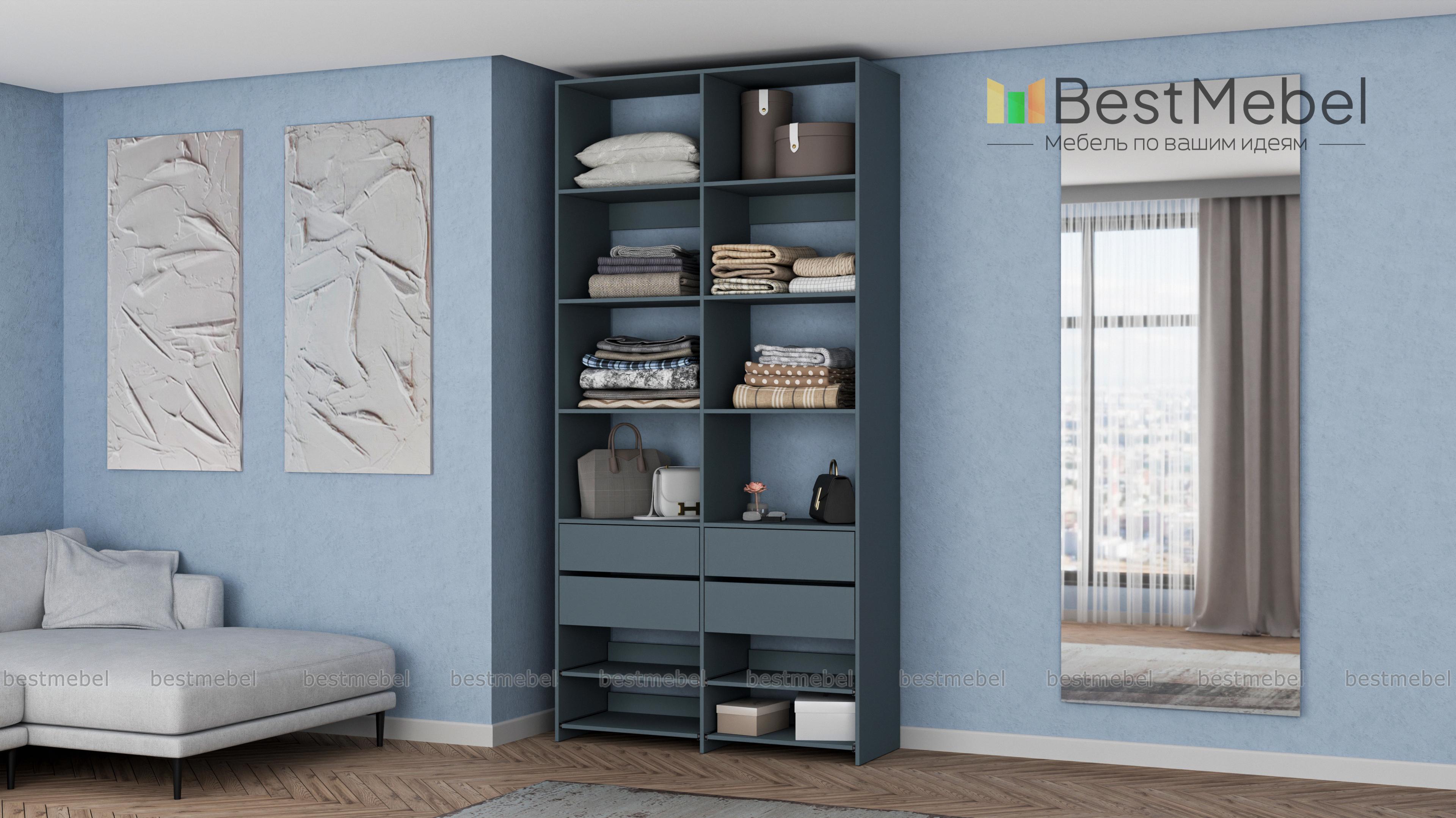 Стеллаж для одежды Мирта 85 BMS компактен и подходит для небольших помещений: прихожих, спален и гардеробных. Верхнюю часть конструкции занимают вместительные открытые секции, а нижнюю — четыре выдвижных ящика для белья и мелочей и удобные полки на направляющих. Продуманная компоновка позволит вам хранить как одежду и аксессуары, так и обувь. Купить стеллаж для одежды Мирта 85 BMS с самостоятельным подбором цвета и размеров вы сможете в нашем интернет-магазине.