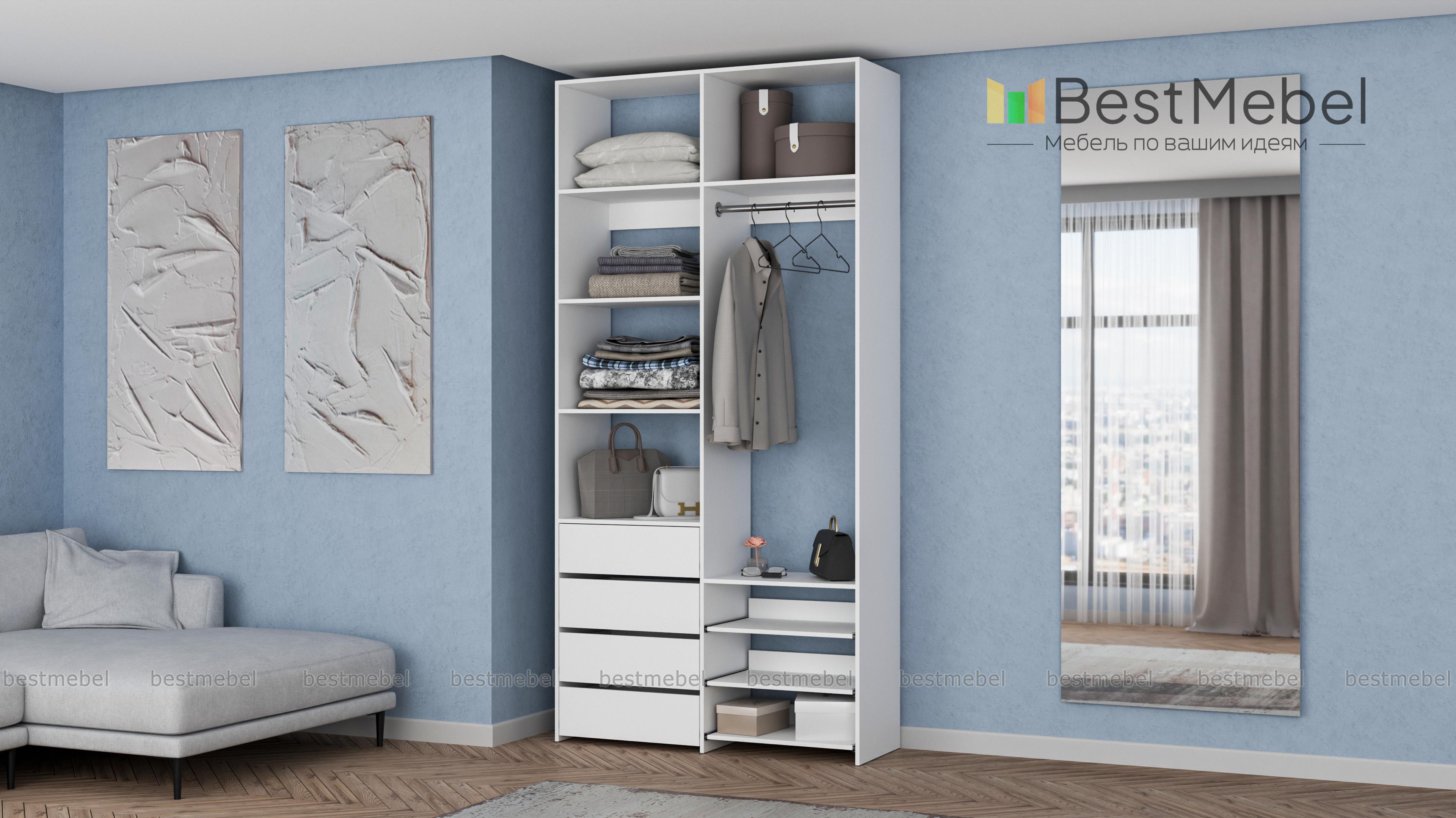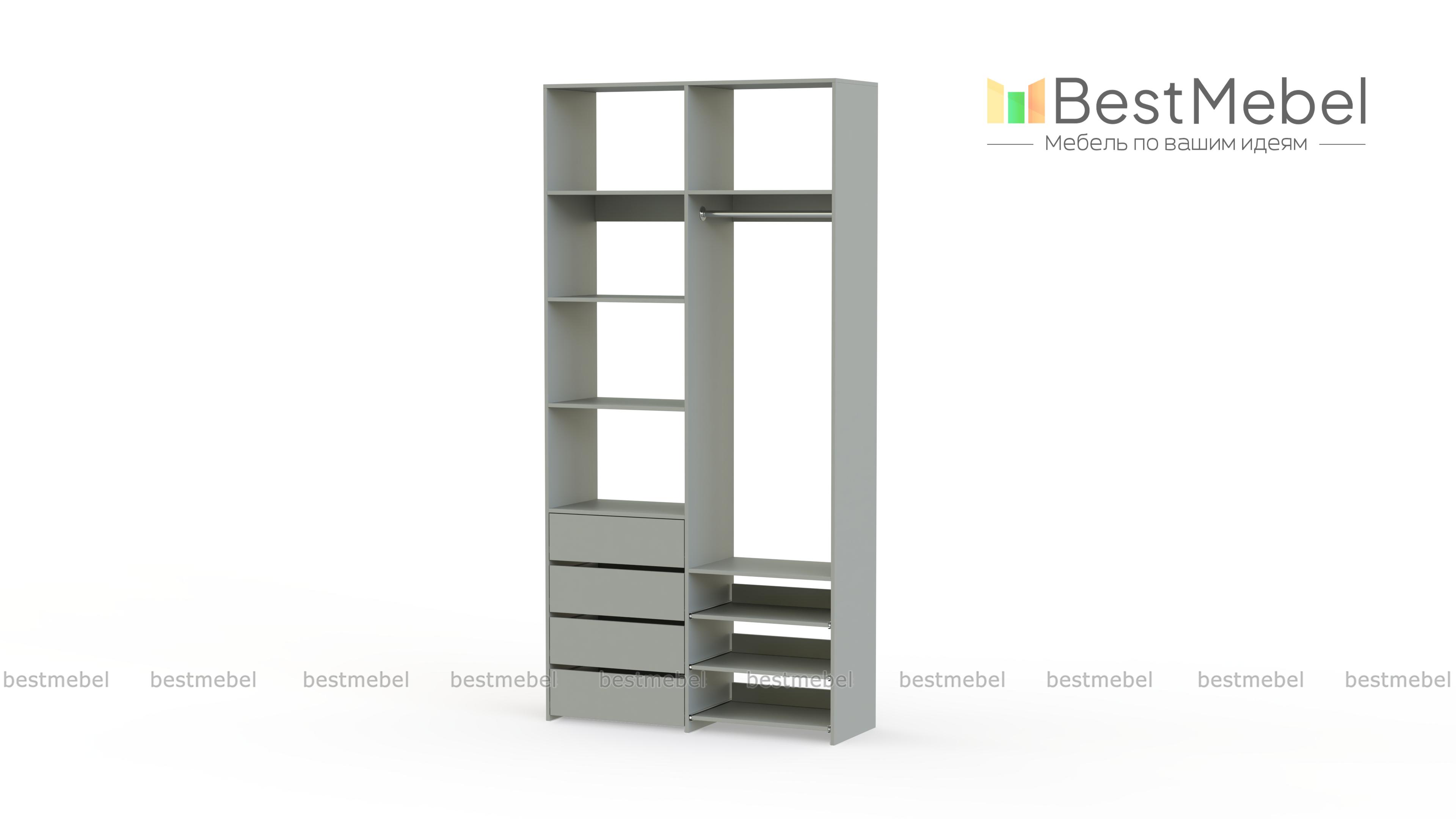 Стеллаж для одежды Мирта 87 BMS оптимален для небольших пространств. Штанга, выдвижные полки и ящики, а также пять просторных бельевых секций обеспечивают достаточно места для хранения базового гардероба. Простой и функциональный дизайн в сочетании с широкой цветовой гаммой позволяют легко комбинировать стеллаж с другой мебелью. Купить стеллаж для одежды Мирта 87 BMS с изготовлением по индивидуальным размерам вы сможете недорого в нашем интернет-магазине.