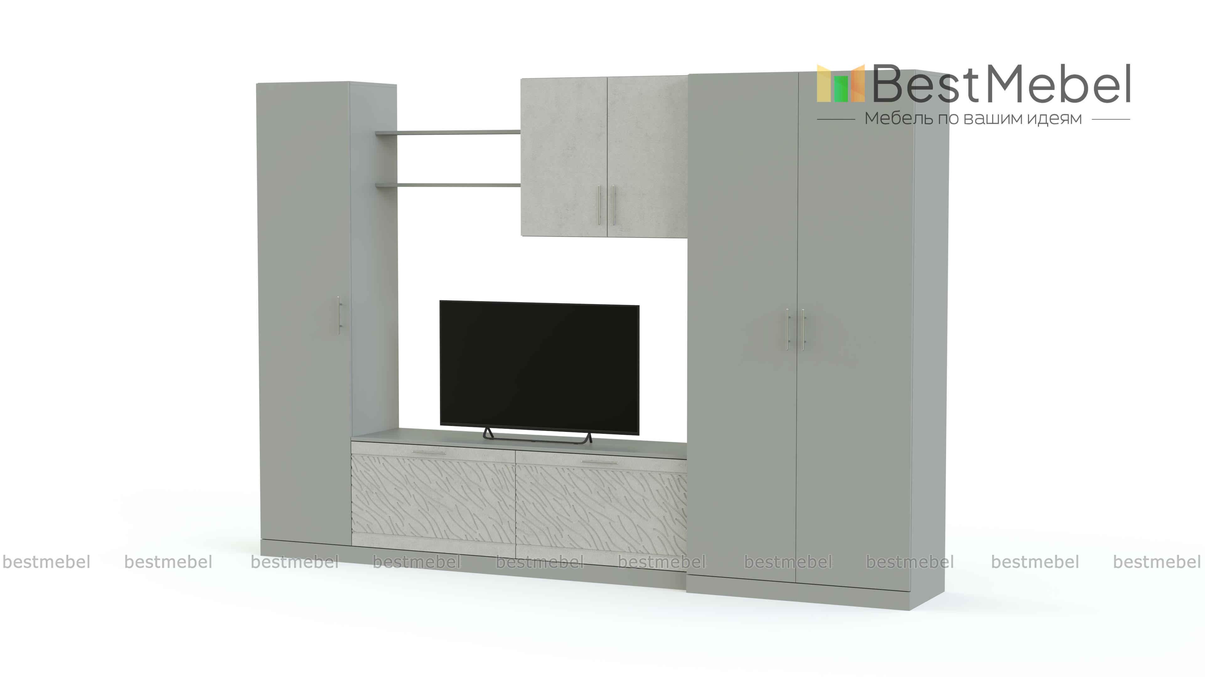 Стенка Вельвет 14 BMS из популярной современной серии гармонично сочетает цветные поверхности, матовые под массив дерева и рельефный рисунок. Вместительная модель объединила в единую композицию с нишей под ТВ в центре двухдверный платяной шкаф, тумбу, навесной шкаф, открытую полку и бельевую колонку. Вы сможете компактно разместить все необходимое, не перегружая интерьер лишними деталями и добавив в обстановку яркие акценты. Купить стенку Вельвет 14 BMS, подобрав цветовое решение, вы сможете в нашем интернет-магазине.