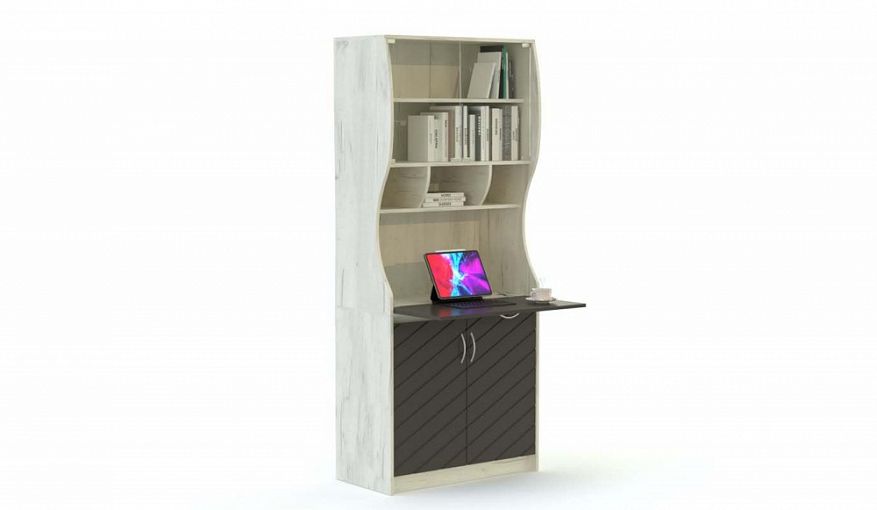 Компьютерный стол-трансформер Нокс 2 BMS с фрезерованным графитовым фасадом и волнообразно вырезанными боковинами станет украшением современного интерьера. Многофункциональная модель может использоваться как книжный шкаф и легко трансформироваться в стол при необходимости. Продуманная система хранения включает в себя застекленное отделение с полкой, глухое распашное и открытые секции, а в центре располагается откидная столешница. Купить компьютерный стол-трансформер Нокс 2 BMS с возможностью изменения размеров вы сможете в нашем интернет-магазине.