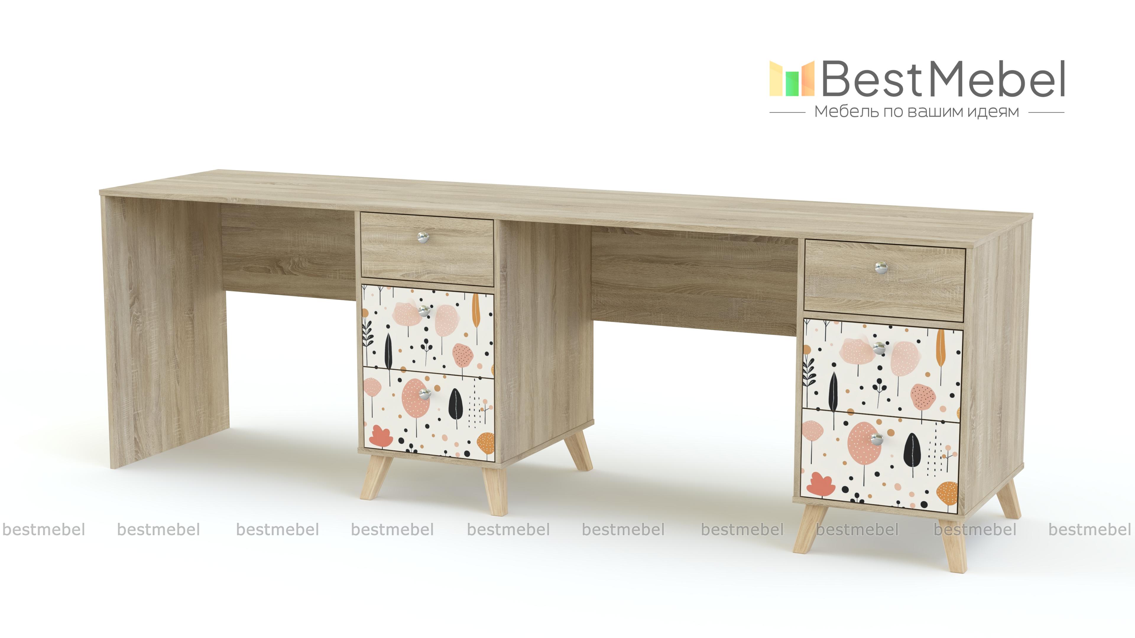 Письменный стол для двоих Эльза 3 BMS обеспечит экономию пространства и комфортное рабочее место каждому ребенку. Удлиненную столешницу разделяют тумбы для хранения канцелярских мелочей и учебников, оснащенные тремя выдвижными ящиками с удобными круглыми ручками. Благодаря сканди-ножкам, теплой нейтральной гамме и стильному принту дизайн стола актуальный и при этом вполне универсальный. Купить письменный стол для двоих Эльза 3 BMS, изготовленный по индивидуальным размерам, вы сможете в нашем интернет-магазине.