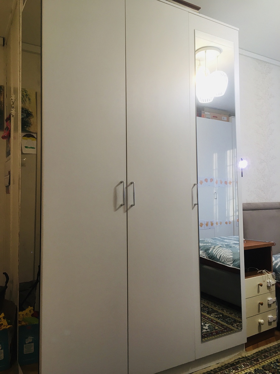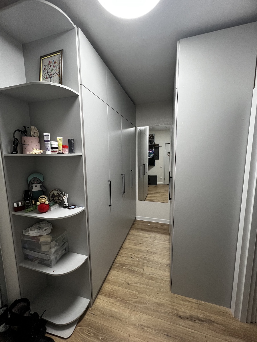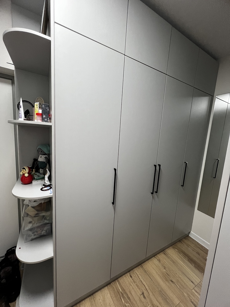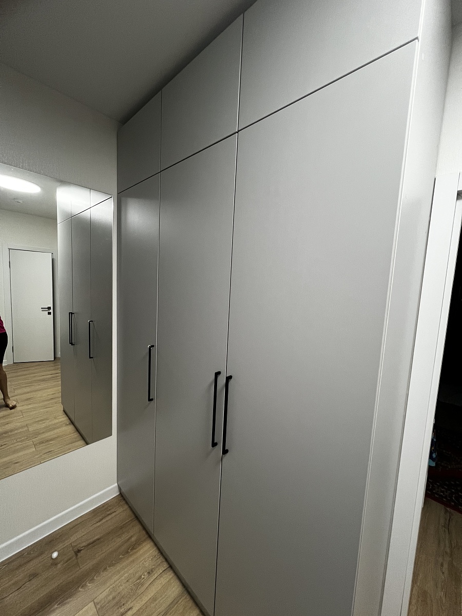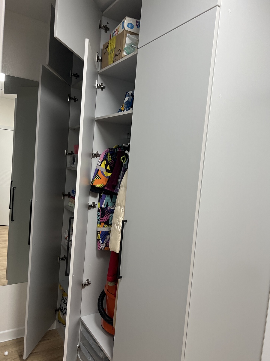 Заказ 00000907751. Это уже четвертый шкаф, заказанный здесь. Очень нравится, что можно выбрать мебель по своим параметрам. Я заказывала все шкафы в цвете "Белый-структура дерева". Ездила в шоурум и там выбрала именно этот цвет. Все шкафы муж собирал сам. Дверь с зеркалом мы поставили не по центру, а справа. Нам так удобнее. Качеством шкафов довольны. Самое главное выбирать толстую кромку. Получается дороже, но оно того стоит. Единственный минус - дверь с зеркалом очень тяжелая. Также мы заказали зеркало на боковину шкафа. Наполнение шкафа тоже выбрали в соответствии со своими нуждами. Также нужна было дополнительная штанга. Все пожелания магазином были учтены, подготовлены необходимые отверстия. Шкаф нам сделали за 4 дня