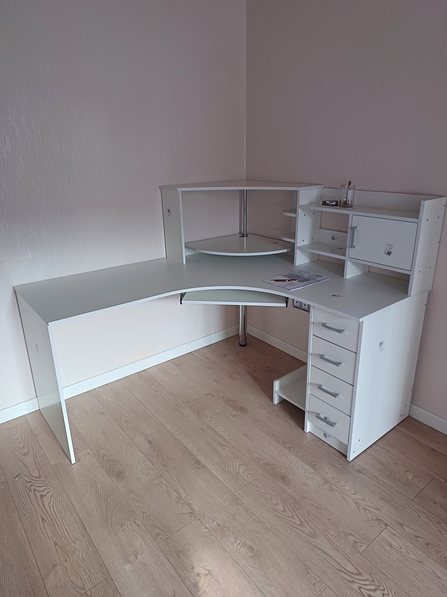 В общем стол неплох. Выбирали со стандартной толщиной мдф, петлями и ящиками с доводчиками. Полки достаточно удобные , среднего размера. Ширина 1400×1600 мм , высота общая с надстройкой 1200 мм. Стол оказался достаточно большой, тк нужно было отдельное рабочее место. Прям существенный минус оказался в ширине выдвижных ящиков 280 мм, не влезают документы формата А4 , зато они длинные😄. Тк размеры выбираем сами при оформлениизаказа , признаю свой промах.