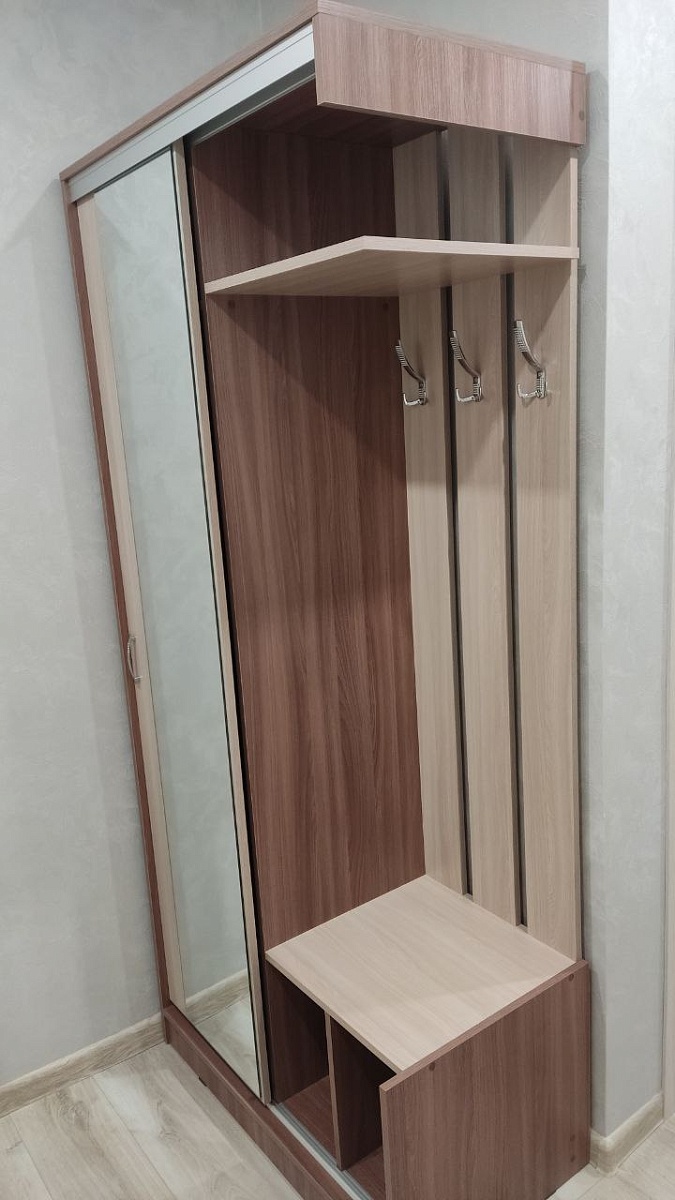 Заказ 00000911110.  Искал прихожую в очень ограниченное пространство, угол 900х900 мм. Готовых решений под такие размеры практически не было. Но во время поисков наткнулся на этот вариант. Именно то, что искал: крючки снаружи, полка сверху, место внизу под обувь, дверца с зеркалом, вместительное внутреннее пространство с балкой и так же с полками сверху и снизу. Размеры изменять не пришлось, стандартные 900х500х2000 подошли как раз. Цвет поменял: Цвет корпуса - Ясень Шимо Темный, Цвет фасада -Ясень Шимо Светлый, Доп. цвет корпуса - Ясень Шимо Светлый.Всё очень понравилось. Рекомендую.