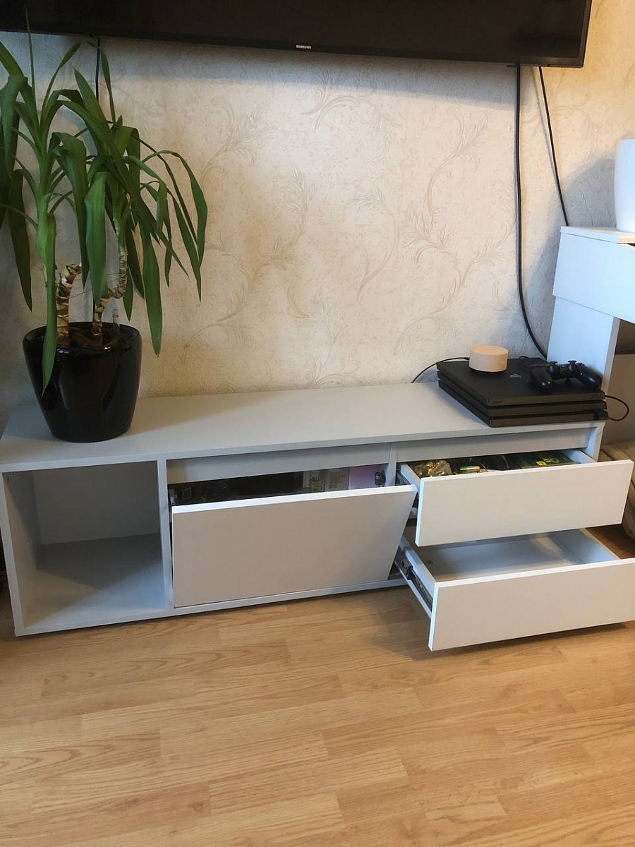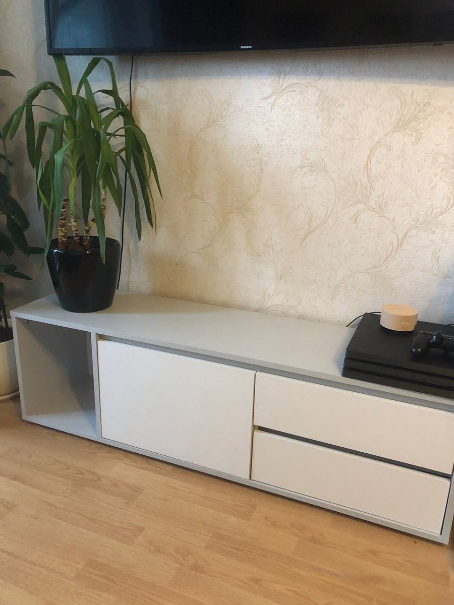 Тумба классная! Переживала, что маленькая (1300х400х330), но оказалась вместительная! Смотрится стильно, аккуратно! Пыль не видна, что немало важно)) Рекомендую!