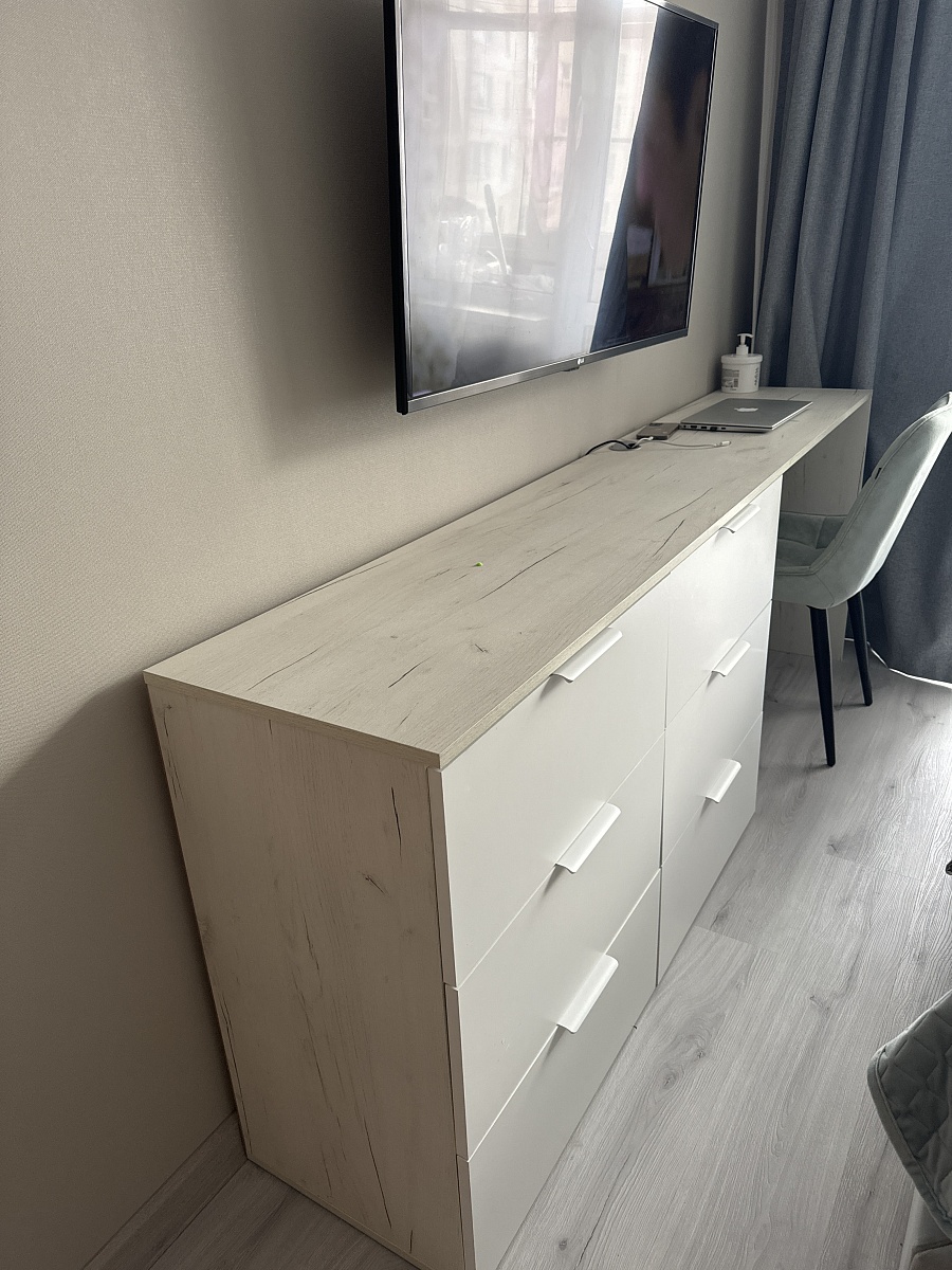 Товар удовлетворил мои потребности!общая стоимость вышла в 50к.Сборщики собрали комод не полностью,не поставив ножки,оргументируя  это тем,что поцарапается пол,в результате нижние ящики при полном открывании трутся об пол.Пришлось доделывать самостоятельно.