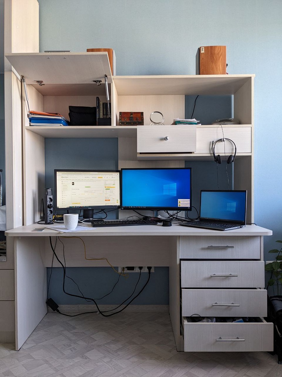 Тот неловкий момент, когда ты удаленщик и тебе нужен прямой стол на 2 монитора + ноутбук. Увы, длинных и глубоких столов в мире не так уж много.Покорило, что этот можно было сделать в длину, ширину и высоту ровно таким, как мне нужно. Ну и скругленные углы стола - у ДСП-шных столов это не очень часто встречаетсяОтличный стол. Возможно, я бы изменила концепцию ящичков справа, но это в принципе не критично. Из личного опыта: столешница потолще смотрится хорошо