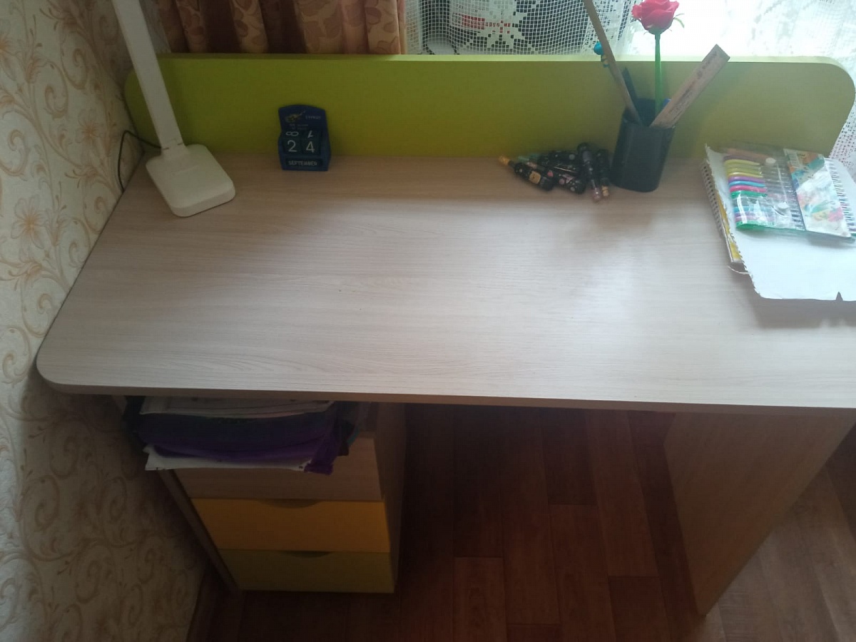 Заказала детям, чтобы делали уроки, а он им так понравился, что теперь поделить не могут, видимо придется второй такой же брать ) Собирали сами, основную часть дети, достаточно легко. Внешне очень хорошо смотрится, размеры подогнали под свои габариты (1000х900х450), ящички в тумбочке маловаты только, учебники не влезают, но тетради /канцелярию и пр. мелочевку убрали. Смотрится в меру ярко, не пестрит, сидеть за ним удобно. Однозначно рекомендую к покупке. Заказ 00000795250.
