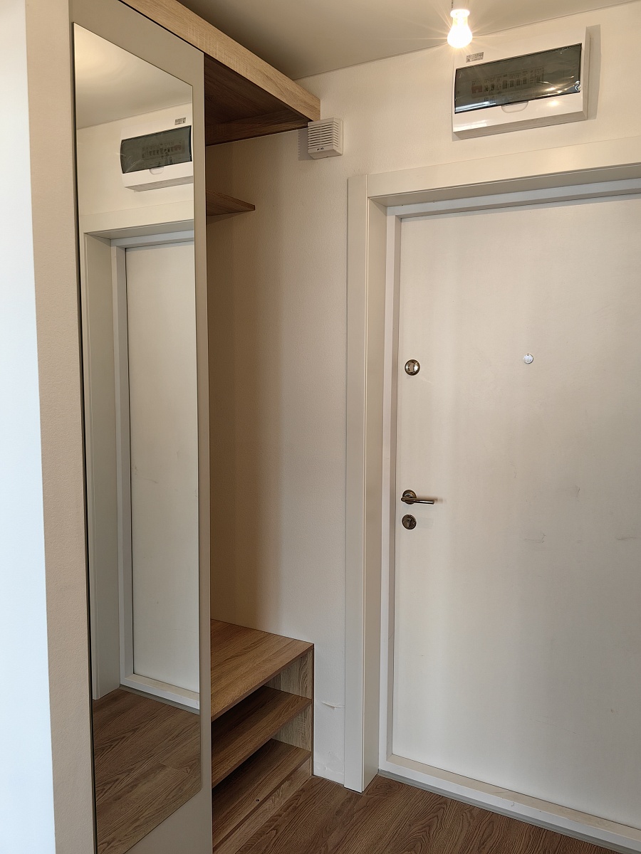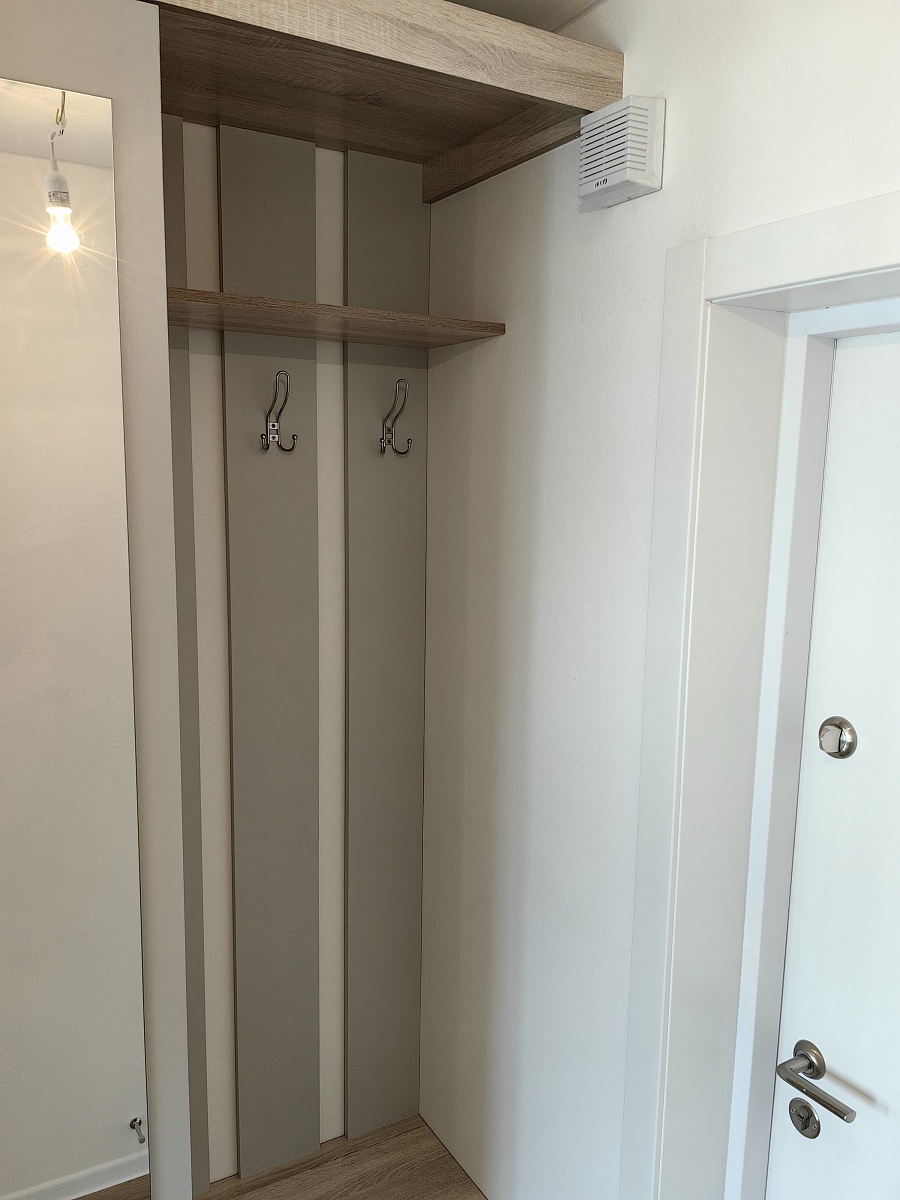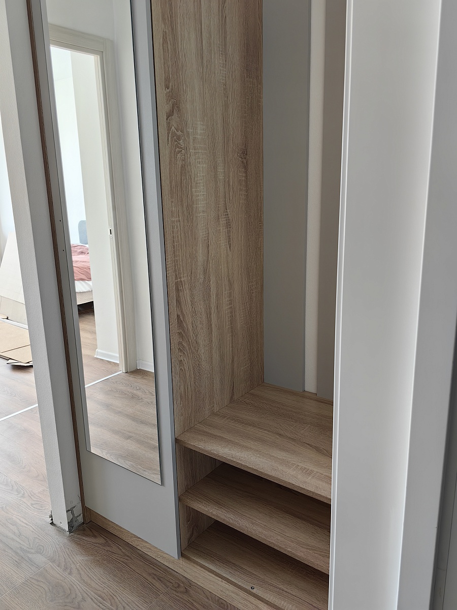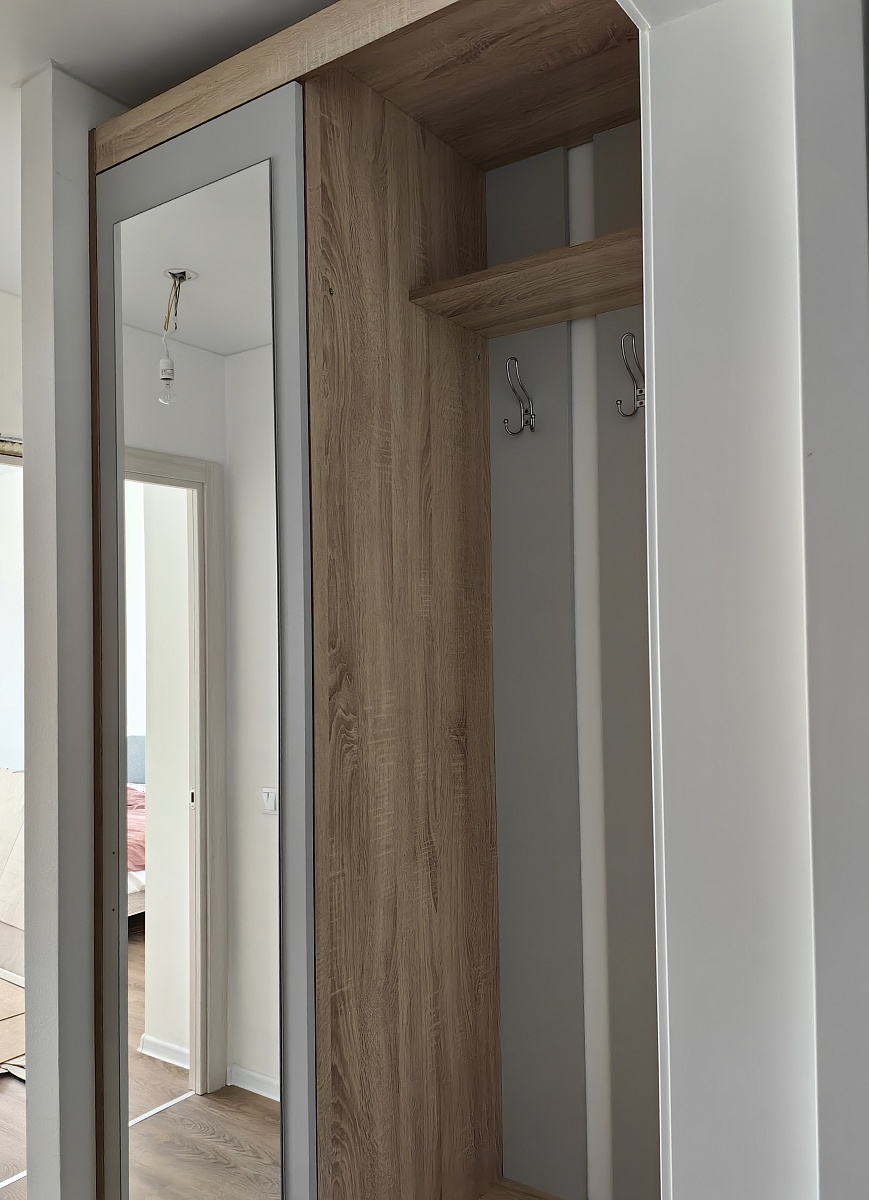 Классная прихожая! Цвет красивый, дуб сонома с серым. Не очень удобно открывается дверь шкафа, в другую сторону от вешалок. Я заказала прихожую впритык размера нашей ниши, ели впихнули её туда, учтите при заказе и убавьте на смЕщё заказала мебель в ванную дуб сонома светлый, прихожая же просто дуб сонома. Что светлый, что тёмный цвет одинаковый!