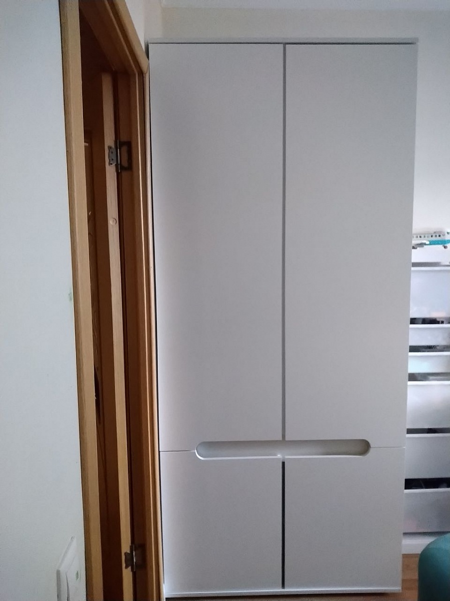 Норм шкаф. Выглядит свежо, красиво.Сборка несложная.Недостаток (за который снижаю звёзды за дизайн):- мы заказывали конфигурацию с выдвижными ящиками внизу.- напротив ящиков для нижней дверцы нет упора, из-за чего она закрывается криво. Проблему решил демпферами (на скриншоте).- при выборе выдвижных ящиков нет возможности в фурнитуре указать нормальные роллеры -- из-за чего там в комплекте самые дешёвые.- ДВП указывал в паз, но у ящиков паза не было.короче с выдвижными ящиками есть ряд потенциальных проблем - имейте в виду.