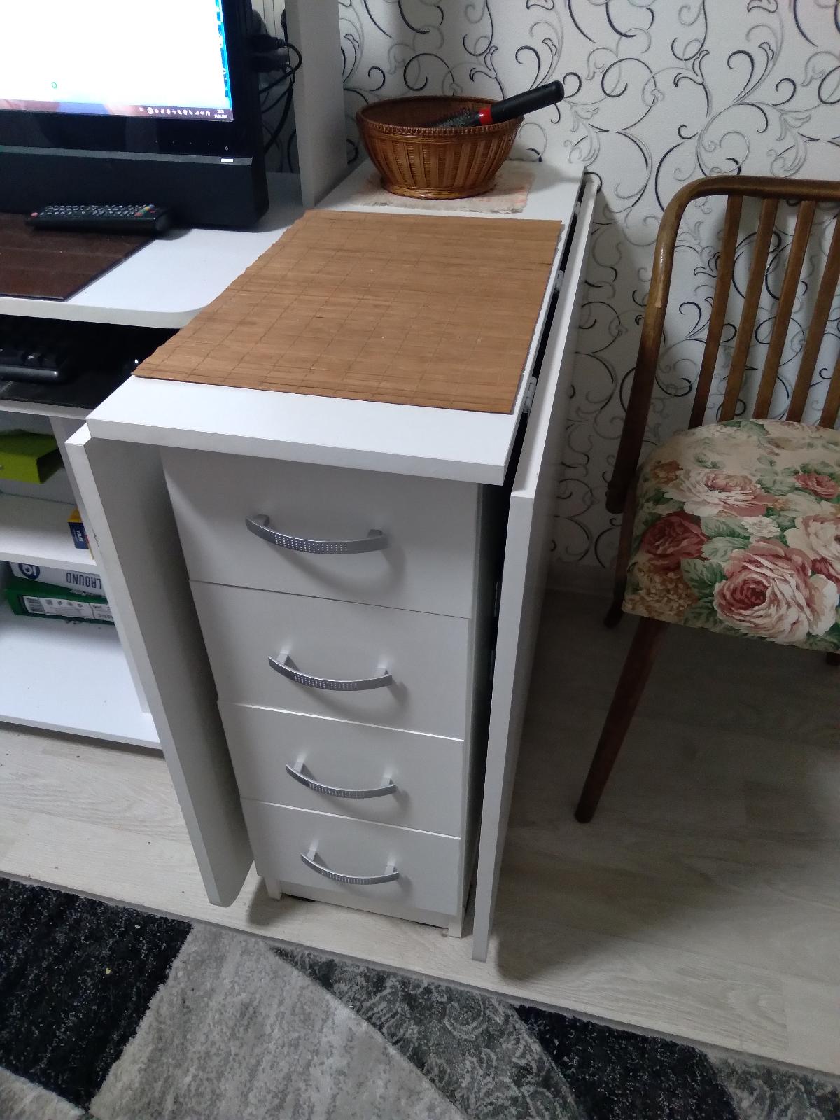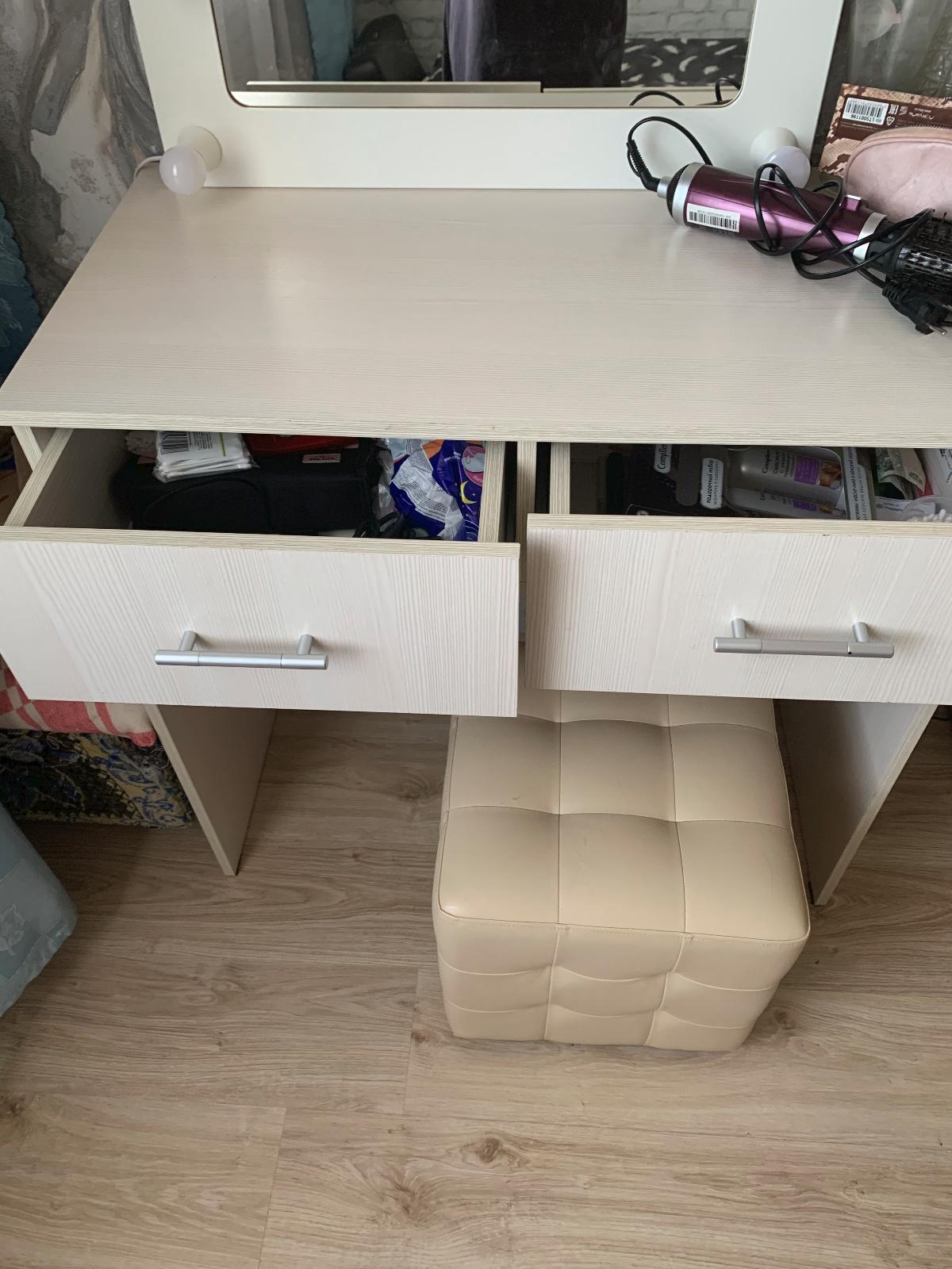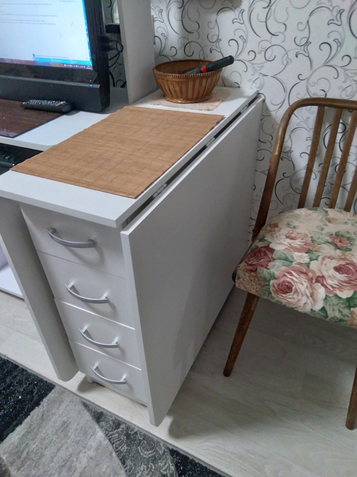 Стол отлично вписался в интерьер. Удобно раскрывается. В повседневной жизни очень актуальны ящички.