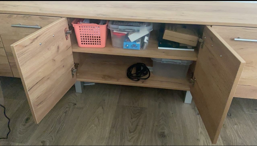 Отличная тумба, приятный современный вид, цвет выбрали золотой крафт, смотрится прекрасно, отдельно докупались ножки хром в цвет ручек, чтобы влажную уборку делать, но можно было и подвесить. На тумбу кладу ноутбук, сумки гостей, фрукты/десерты, много чего, внутрь вмещается много контейнеров с всякой всячиной: книги, нитки, лекарства и пр. Я на неё сажусь иногда, выдерживает (по этой причине не хотели подвешивать). Размер тумбы на фото: 220 × 44× 40 см. Рекомендую!