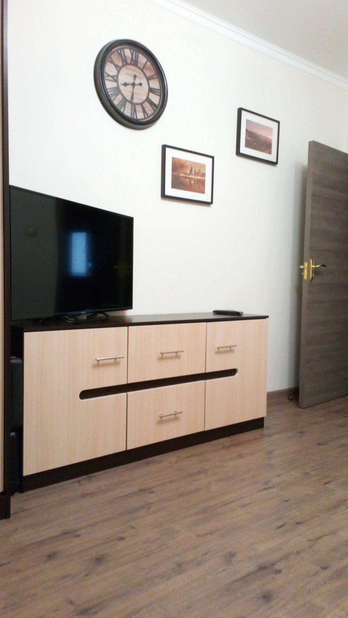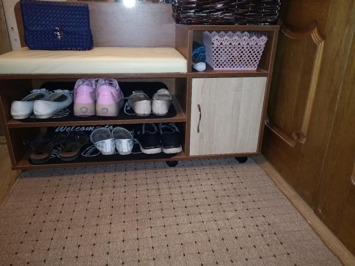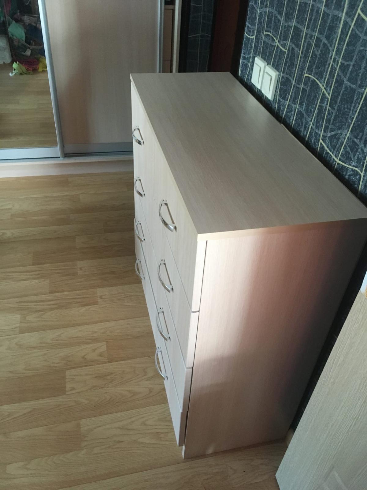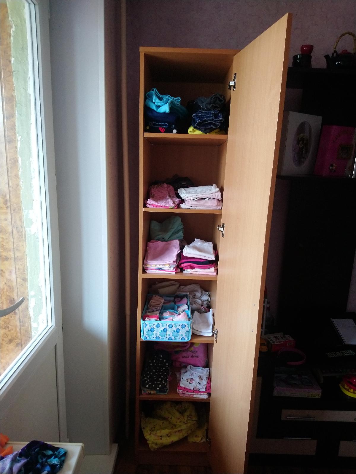 Шкаф нас удивил. Он оказался длинным и тонким (НЕ таким широким и коротким как на ваших картинках). Матового стекла в нем тоже нет. Он весь деревянный (или что там за материал). Мы думали хранить в нем папки, но они, конечно же, НЕ везли. В итоге мы приспособили его под детские вещи и, в целом, довольны. Смотрится стильно, как видите на фото (сверху лежит рамочка, не обращайте внимания). Убираться очень удобно, когда мебель висит. Благодаря вашей компании столы у нас тоже навесные и мы счастливы)