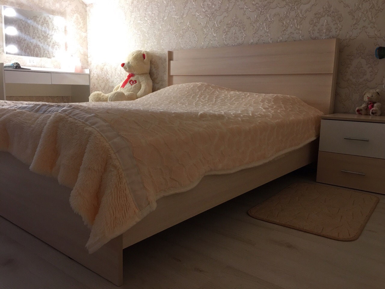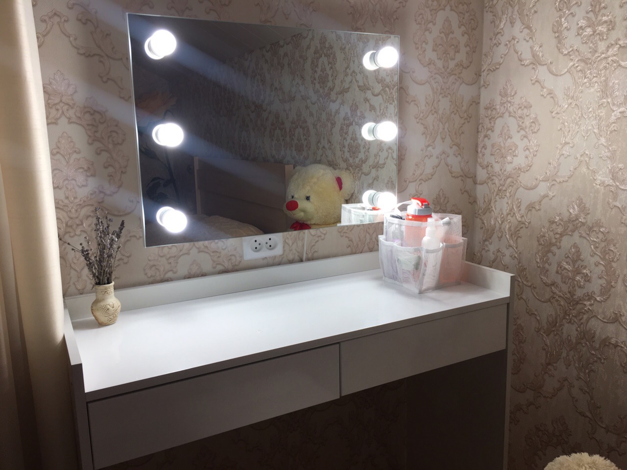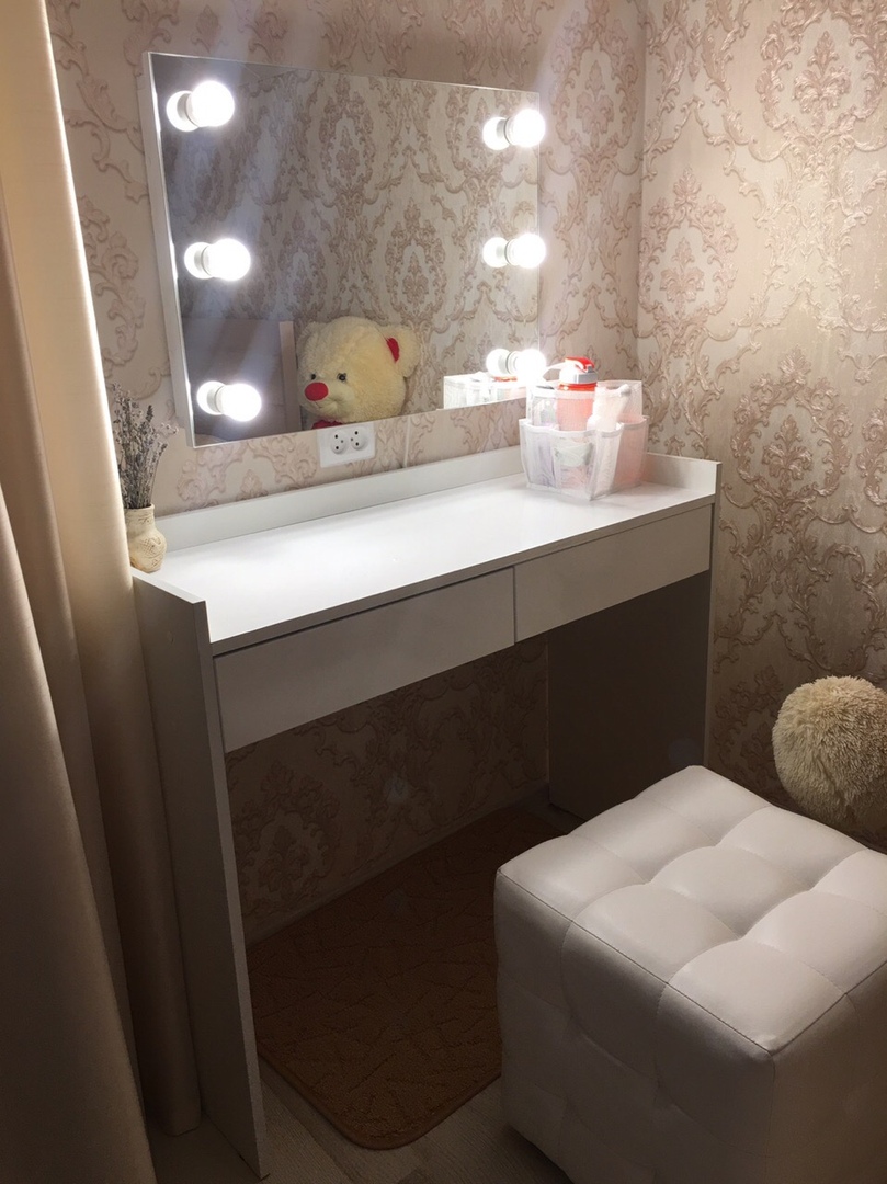 этот туалетный столик меня очень порадовал! увидев фото на вашем сайте, я сразу же его заказала. доставку ждала не долго и когда впервые включили лампочки, было ощущение, что я в салоне красоты! каждый день им восхищаюсь, когда крашусь. пуфик тоже подобрала на вашем сайте и все удачно сочетается. в столике есть два выдвижных и очень удобных ящика. каждой девушке рекомендую иметь такой же в своей комнате, чтобы ощущать себя принцессой!